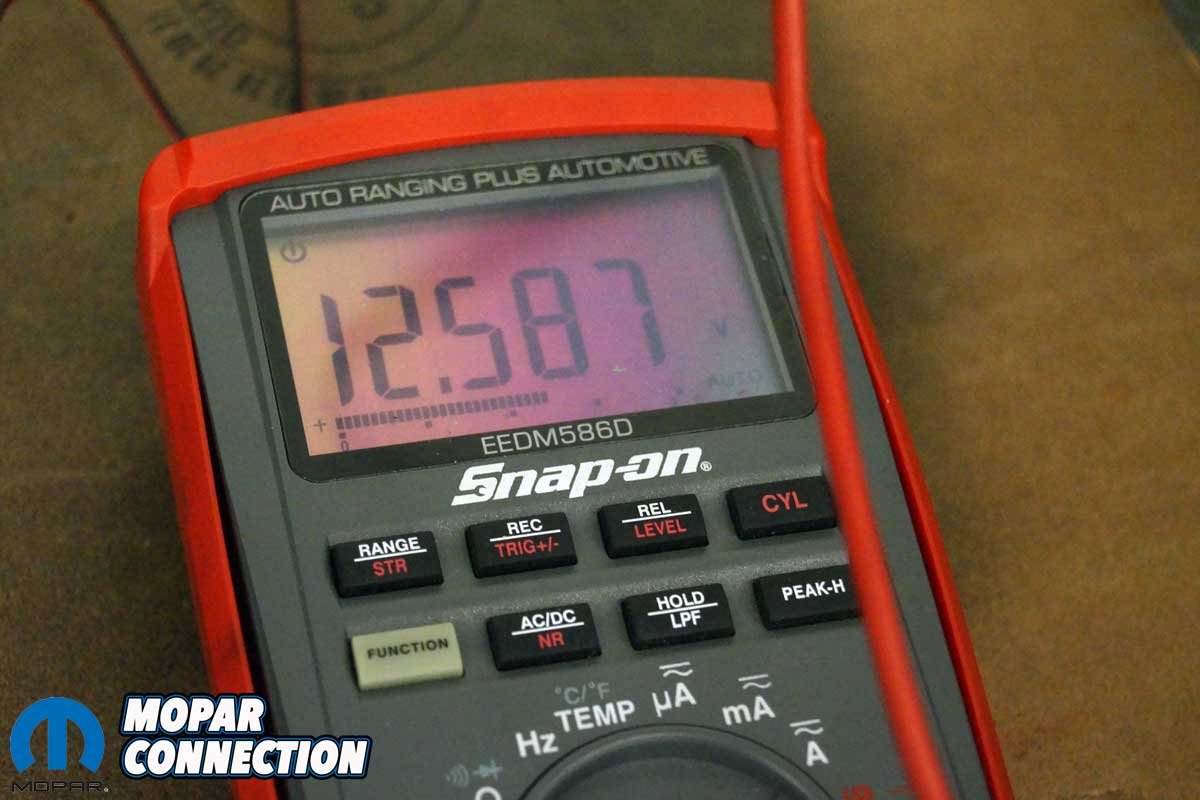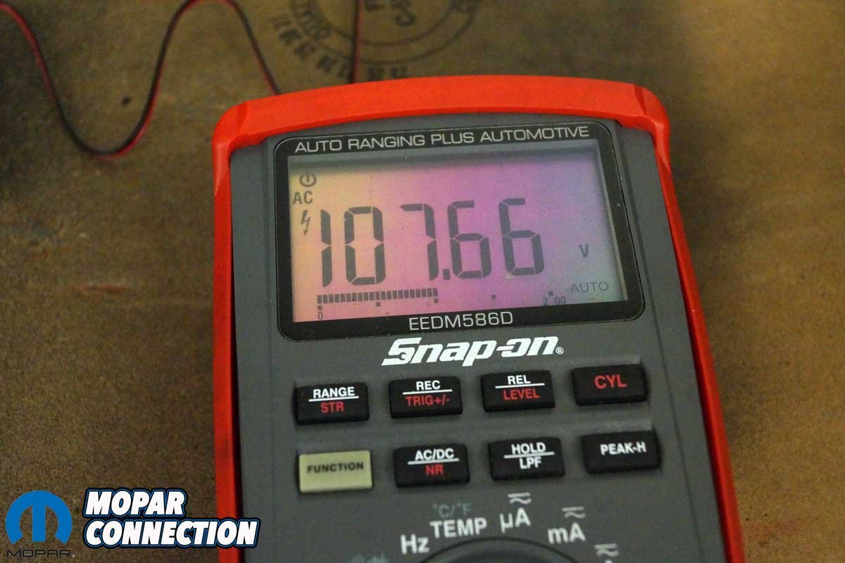 Above Left: The jump box provided 12.587 volts to the inverter, which simulated nearly full voltage, like the backlighting controlling switch on the dash in the full brightness rotation selection. Above Right: The inverter increased the 12.587 volts to 107.66 volts (AC) rms and illuminated the EL sheet. When the charging system operates, the voltage would rise to 13.5 to 15 volts, and the inverter voltage to the EL sheet would close in on 114 volts (AC) rms.