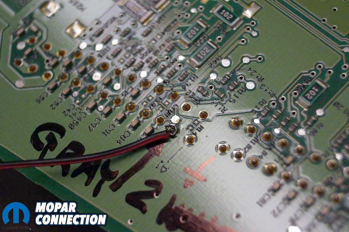 Above: After studying the factory service manual, I determined which pins on the instrument cluster circuit board provided voltage to the inverter. I soldered the inverter ground (left) and 12-volt source (right) wires onto the circuit board.