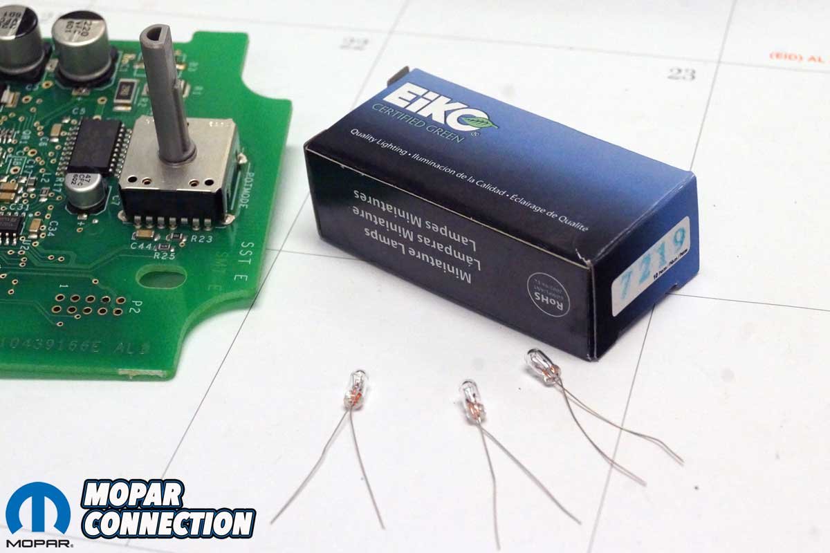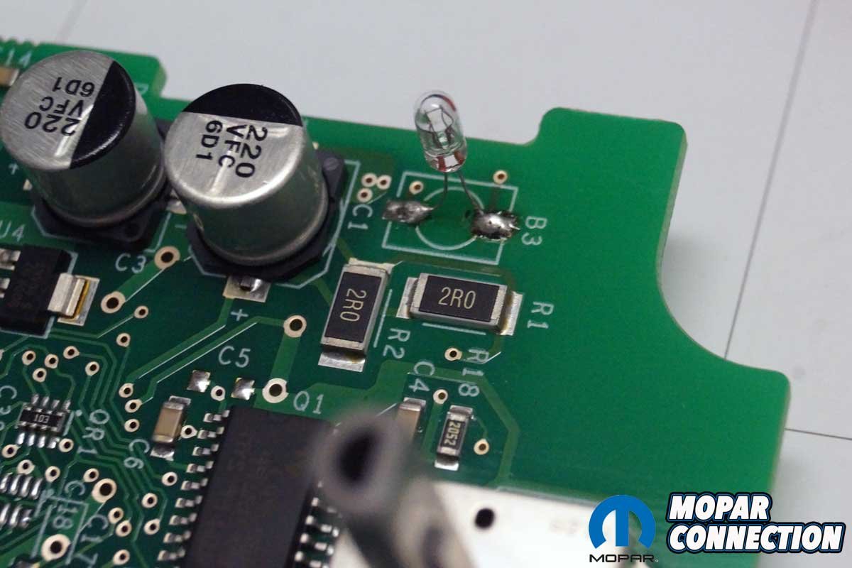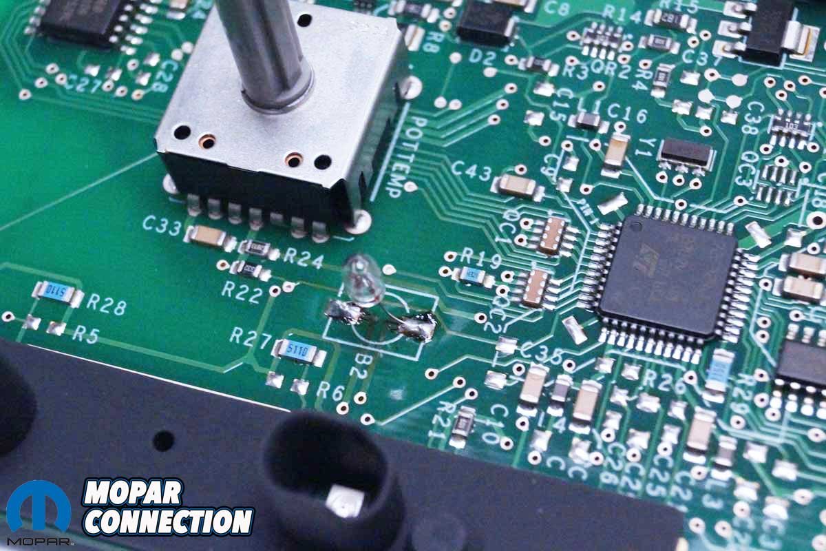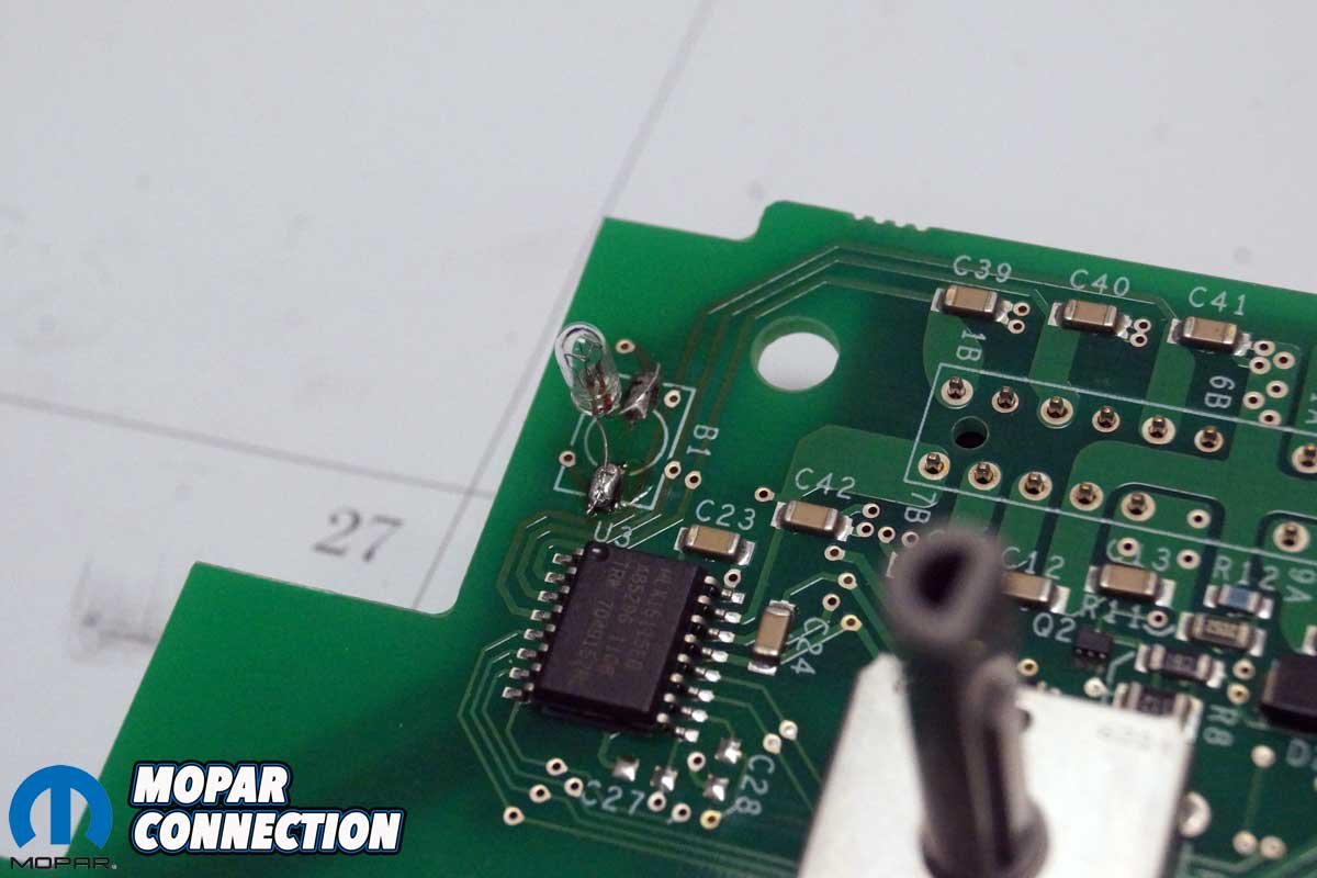 While assessing the cluster, I noticed the HVAC control head did not illuminate when the headlamp switch was rotated to the “on” position. I pulled the control head and disassembled it to find that three “permanent” incandescent bulbs had failed. The Chrysler repair was to replace the entire control head, which again was not a budget-friendly idea, so I searched for incandescent bulbs that I could solder onto the circuit board.