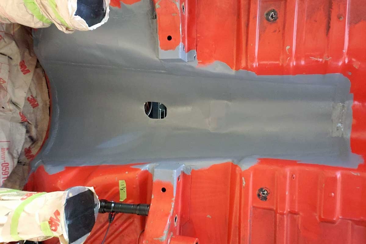 1. Bruckhart used the template provided by Silver Sport to cut the floor. Not only did a section of the floor pan need to be removed but also a portion of the transmission cross member.