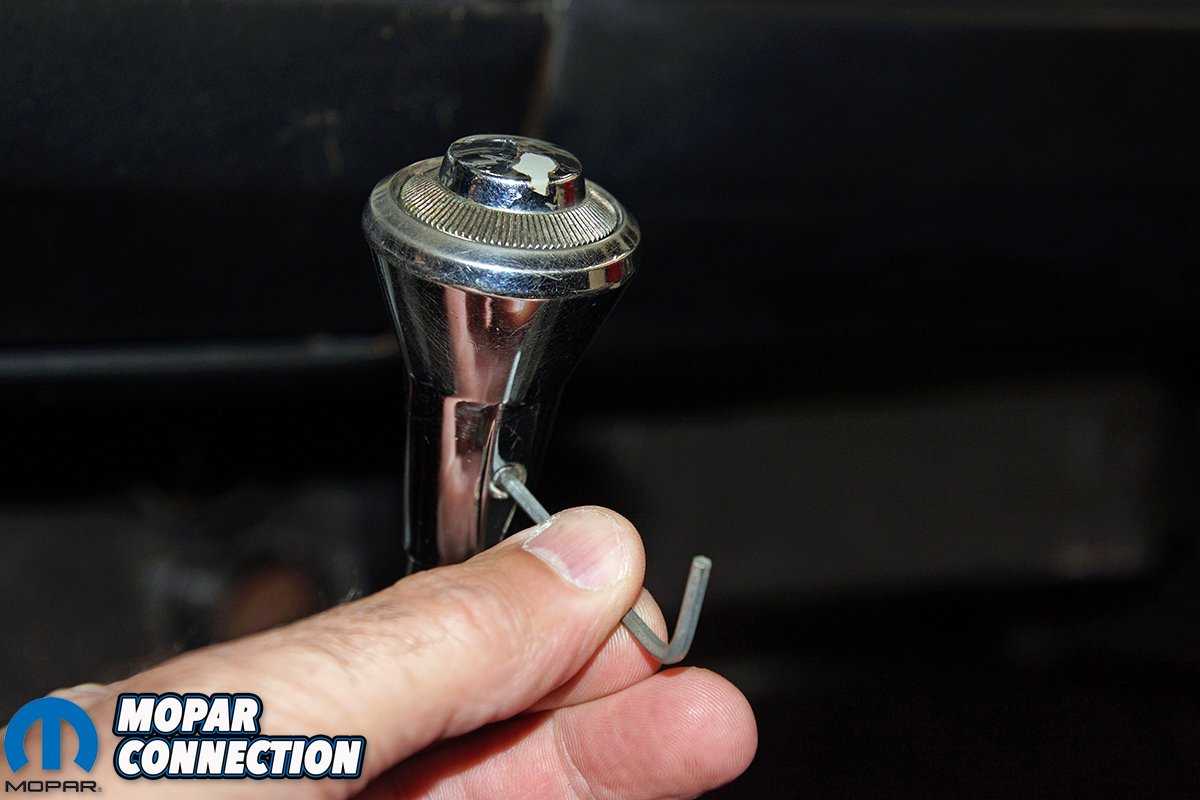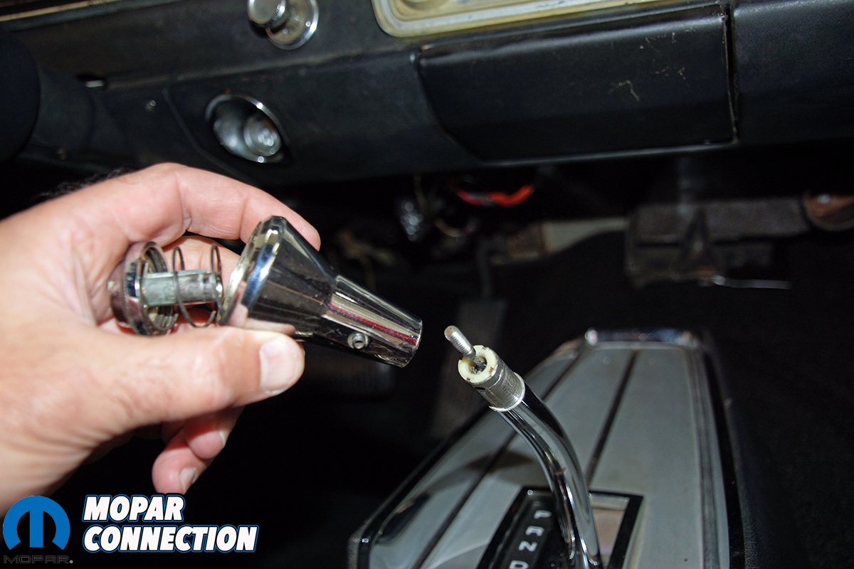 The nut on the wire attached to the cigarette lighter was loosened and removed, and the wire was detached from the lighter’s stud. The console selector light bulb socket was twisted and pulled from the bezel. With the cigarette lighter and the light bulb disconnected, the shifter knob jamb screw was loosened. The knob, spring, and button were unthreaded from the shifter handle. The console was lifted up, slipped over the knob-less shifter handle, and it was wiggled around the passenger seat and out of the Dart.