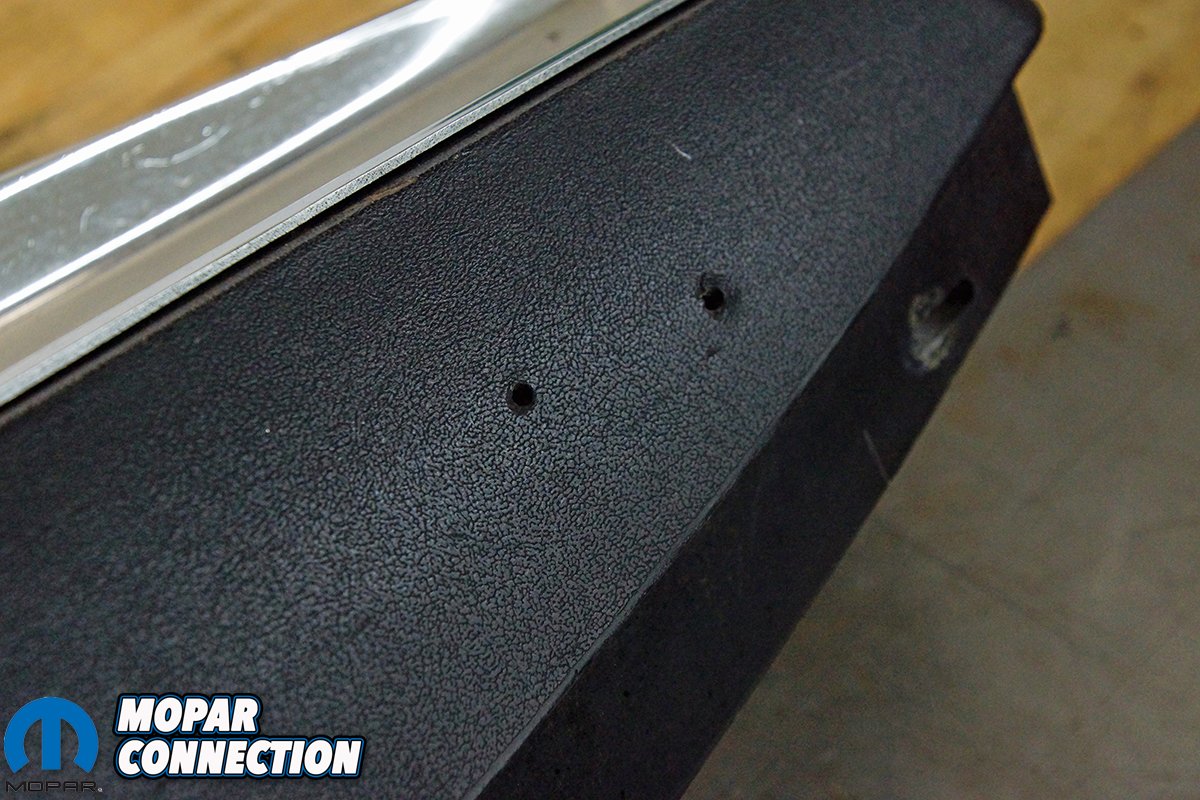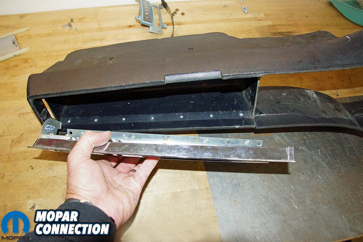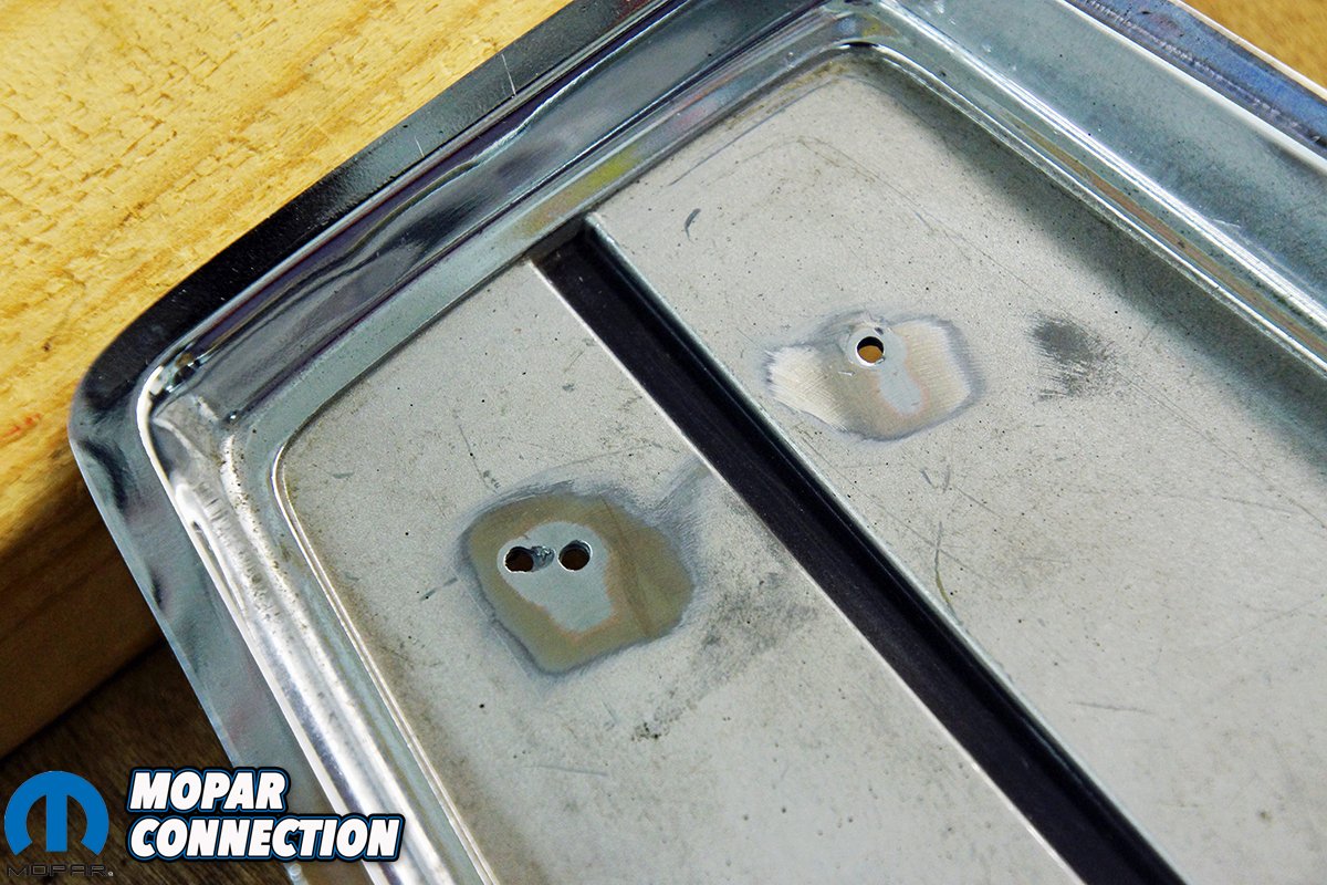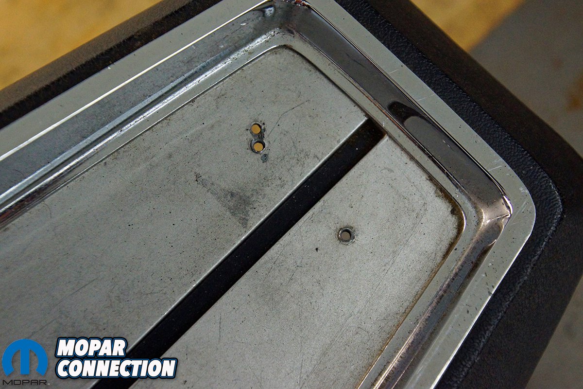 Instead of welding the holes closed and then sanding and painting the console cover, we found Detroit Muscle Technologies, LLC. offered a plastic overlay in a matte silver color to simulate the painted areas of the console cover. The overlay for our Dart (#AXX6668OL12-SILVER) was a .030-inch thick, laser cut 3M adhesive backed overlay, which fit our console cover and the glove box cover perfectly. If you prefer a woodgrain overlay Classic Industries has a few options on their site.