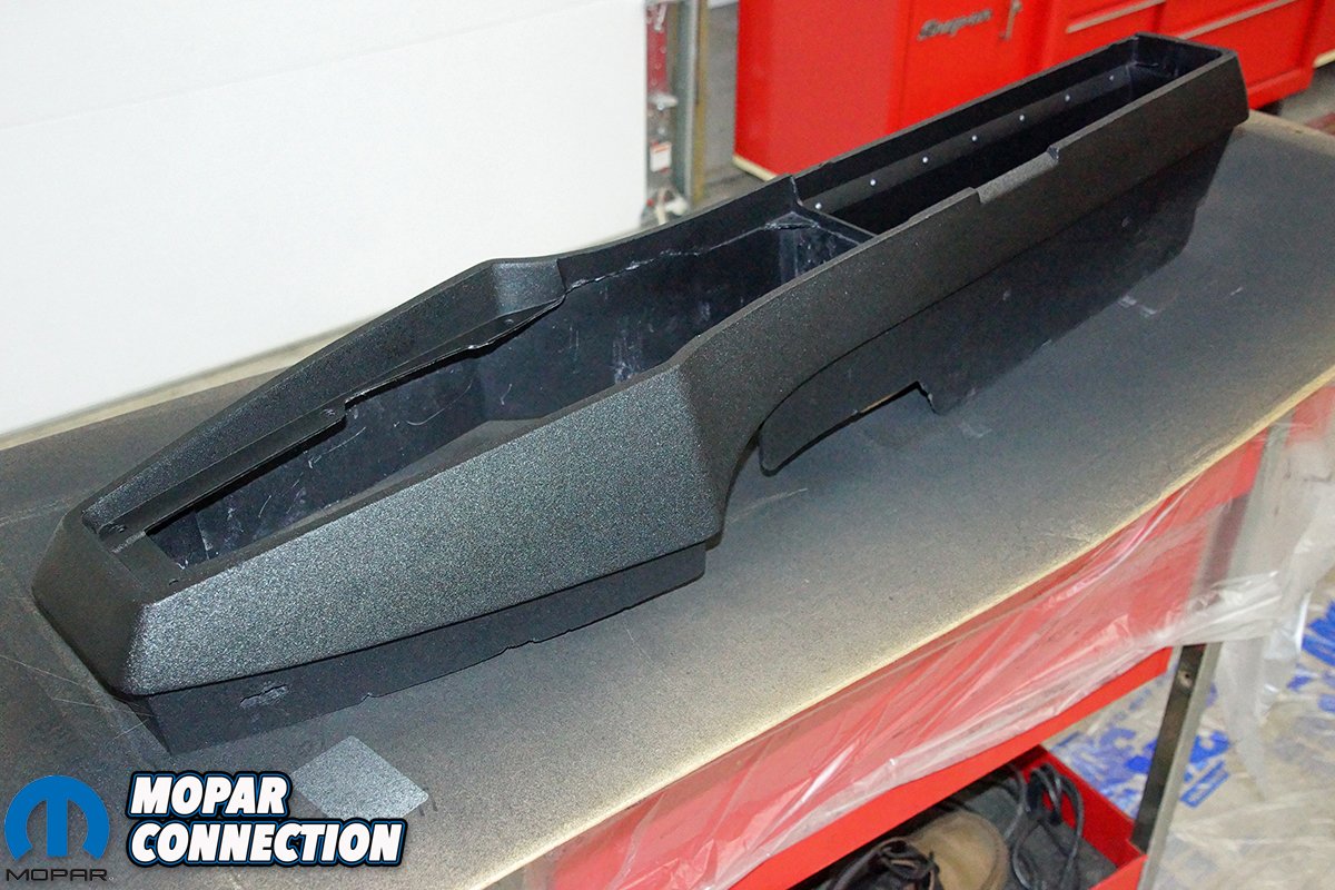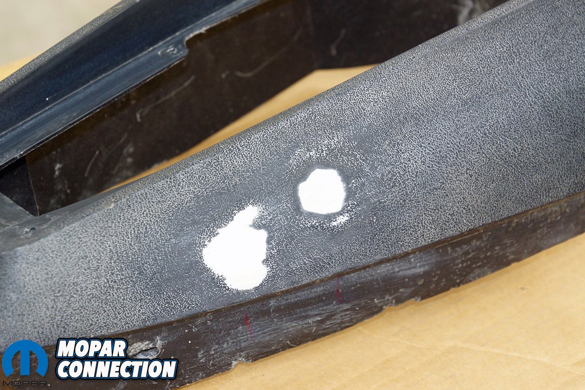 Once the console cover and the glove box cover were finished, we repaired the four holes drilled into the console frame. Each hole was ground down about 1/8-inch below the surface of the console frame. We filled the holes with Perfect Plastic Putty (part no. BD44), and once set, we progressively sanded the console with finer grit sandpaper until we reached 4000-grit, which provided the smoothest finish we could achieve.