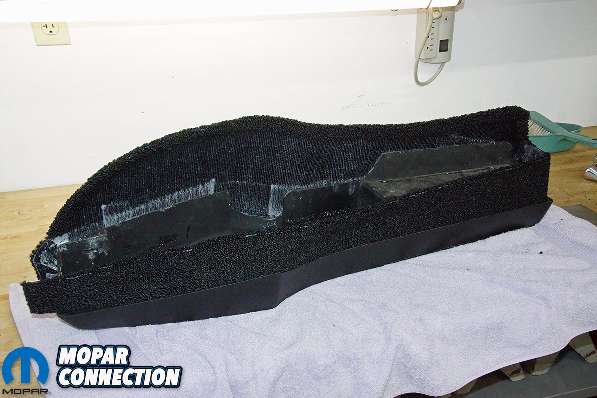 We let the console sit for 48 hours before we added the finishing touches. The console originally came from the factory with carpet around the entire lower circumference. Ours was missing, so we ordered a pre-cut black carpet for the console from Classic Industries (#MA684801). The pre-cut carpet was test fitted to the console, and once we were sure the fit was correct, we marked the carpet’s position on the console and then removed the carpet.