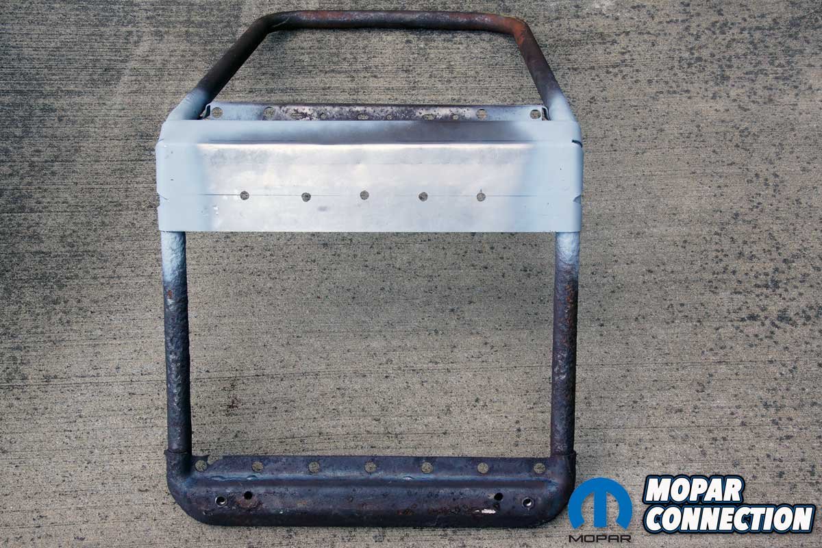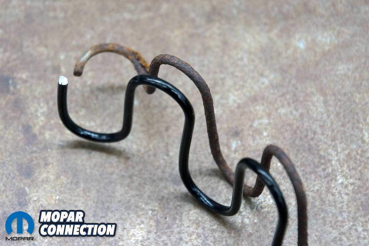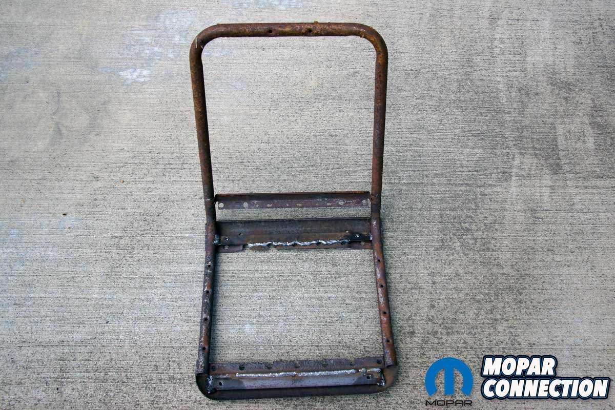 The rear cross members were bent into shape, and once completed, one was welded to each frame rail. Next, I evaluated the four-seat base (bottom) springs and the two-seat upright (back) springs on each frame and decided the springs would need to be replaced. Luckily, the seat foam for both seats was reusable. Finally, I painted each seat frame black.