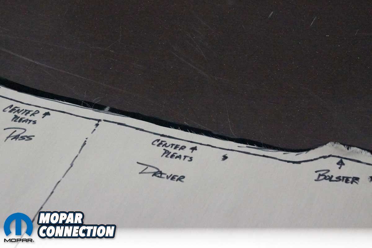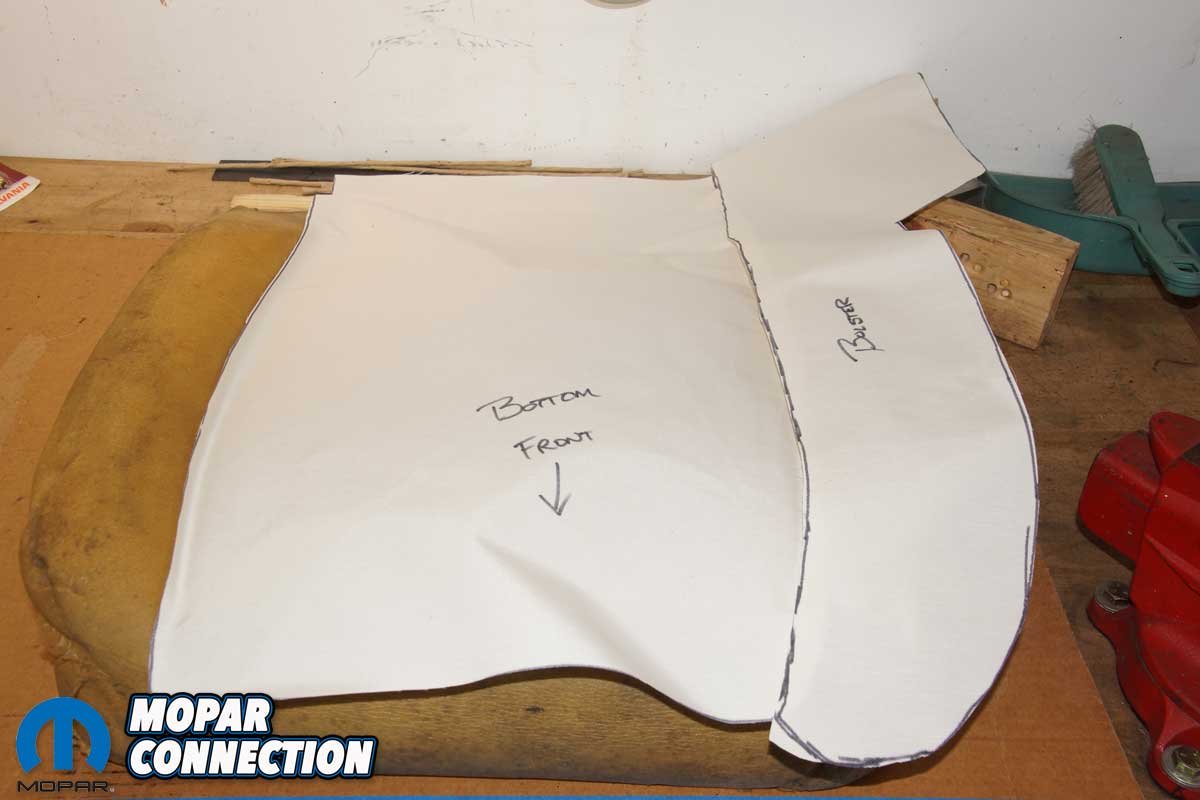 Because I did not have the original factory seat covers to dissect and use as templates, I had to make several measurements of each seat cushion and both frames to develop several patterns. From the dimensions, I made rough cut masters out of inexpensive material that I trimmed to size once they were laid on seat foam. Each master had a ½-inch seam allowance to accommodate stitching the pieces together.