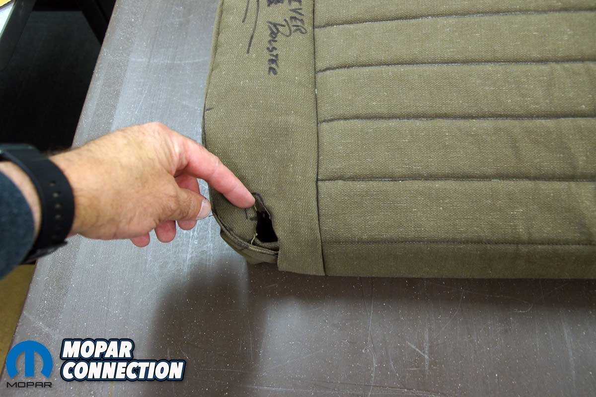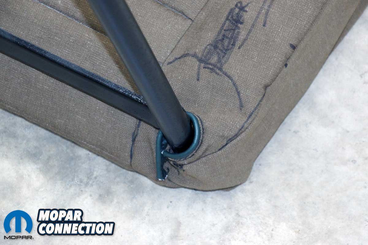 Once the listing rods were fastened, I pulled the insert around the lower upright cross member and affixed it to the frame. Next, the bolster flaps were stretched over the foam, and I used cotton wadding from a previous seat cover story to augment the booster padding. Lastly, I zipped the cover together and fastened two tether strips to the frame.
