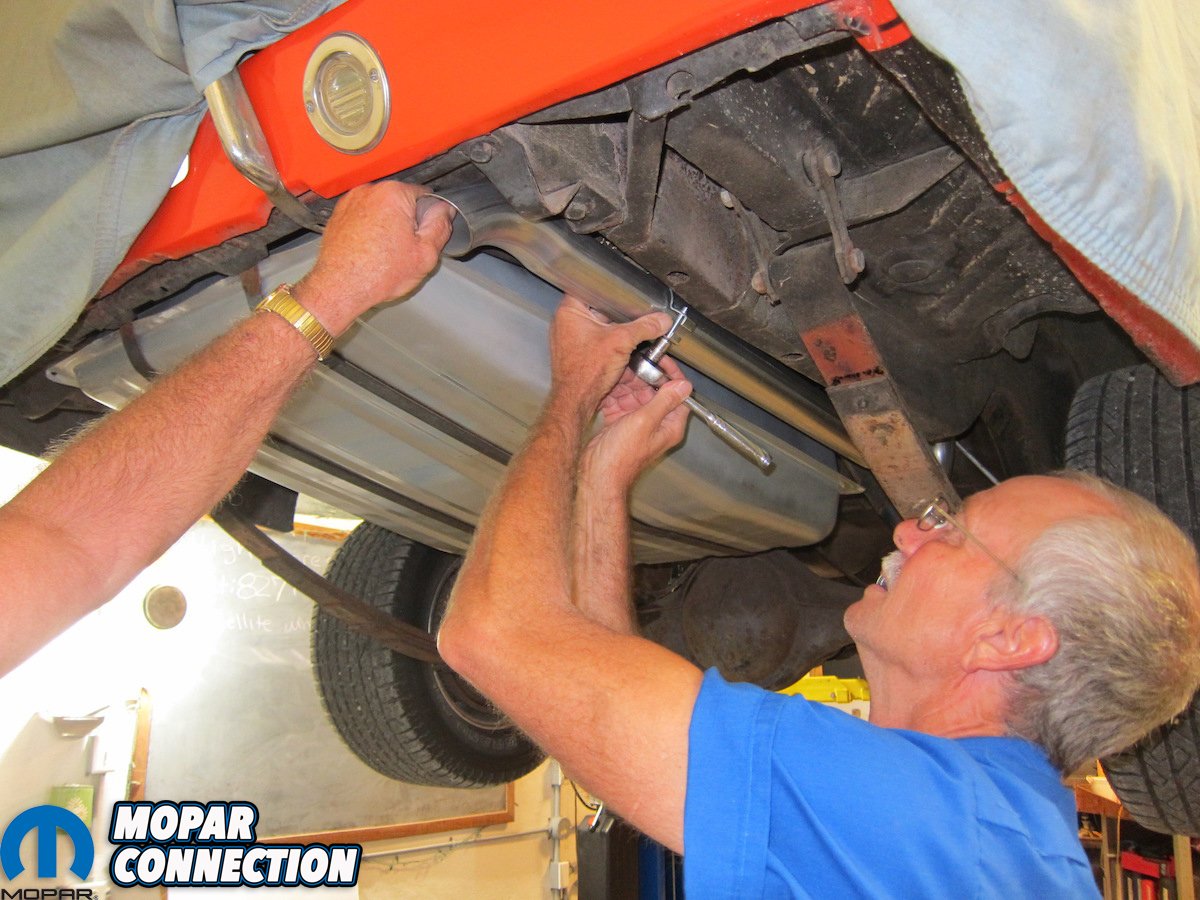 The main support hangers featured an integrated clamp just like factory, so both mufflers were tilted and adjusted appropriately before putting the torque to them. Moving forward, a set of self-explanatory clamps connected the back half to the H-pipe. Lastly, four flange bolts up front were treated to 50 ft.-lbs. per the service manual.