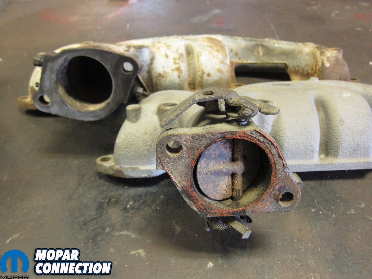 Above: The passenger’s side manifold varies from ’68-’69 (pictured right, painted gray) to ’70-’71 models in that the flange is rotated differently.