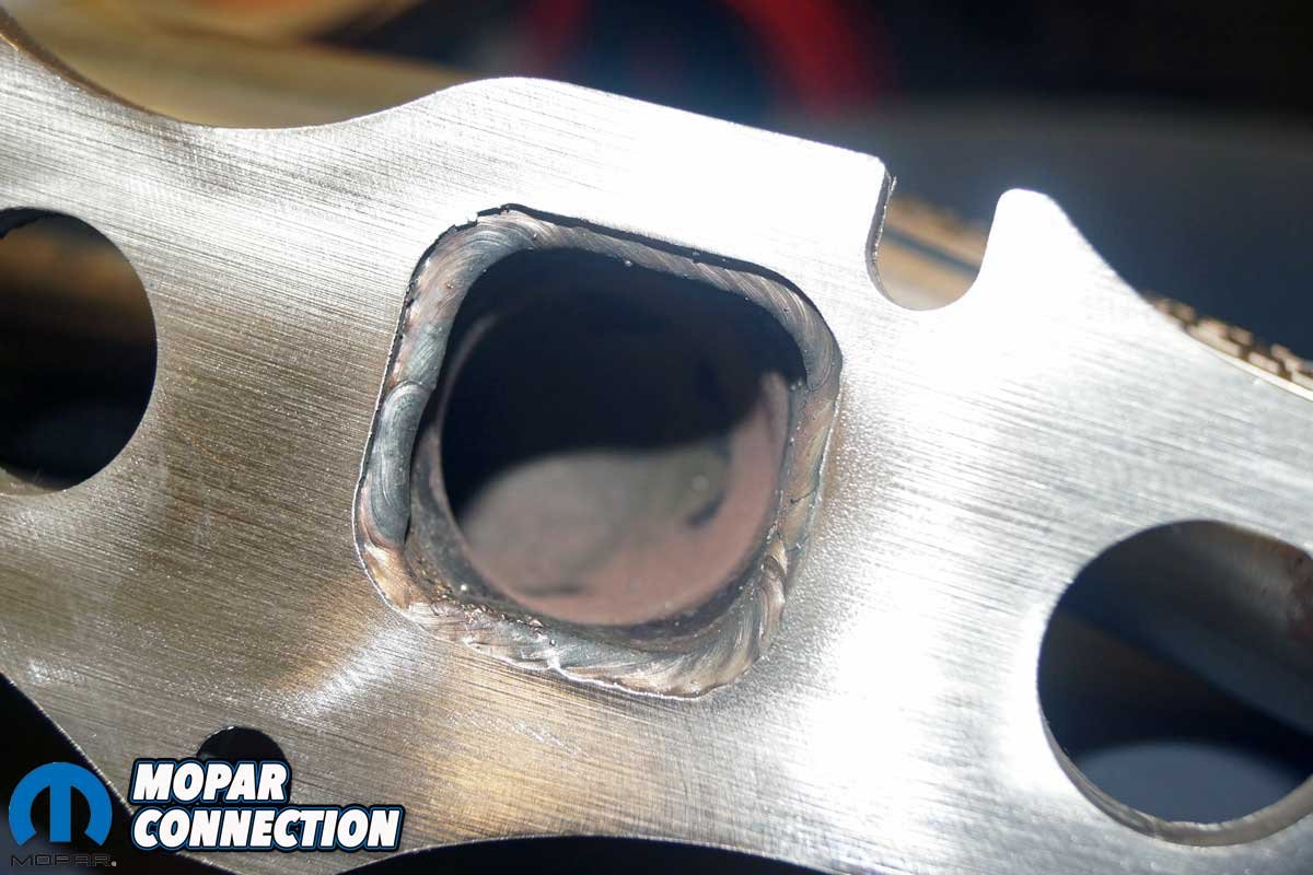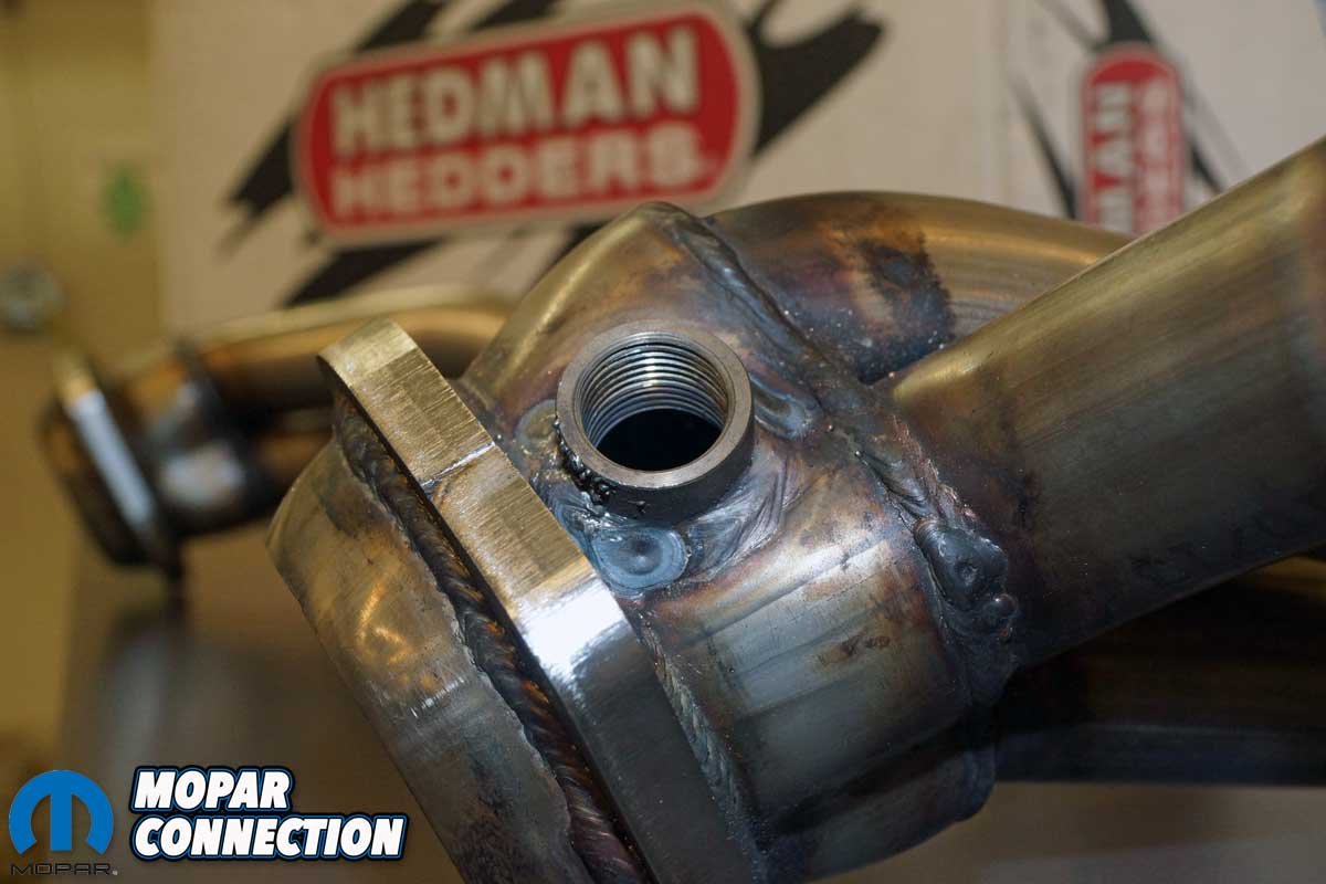 Above Left: The primary tubes are completely welded to the 3/8-inch flanges. Note the bolt-hole cutouts at the top of the photo. There are four per header that allows for easy installation of the header. Above Right: The header collector houses the O2 sensor bung. Check out the quality welds on the header collector flange.