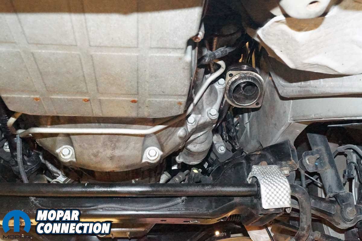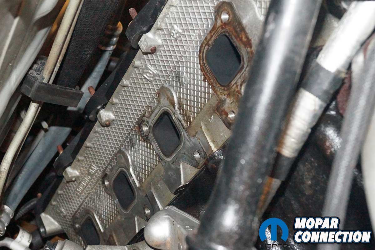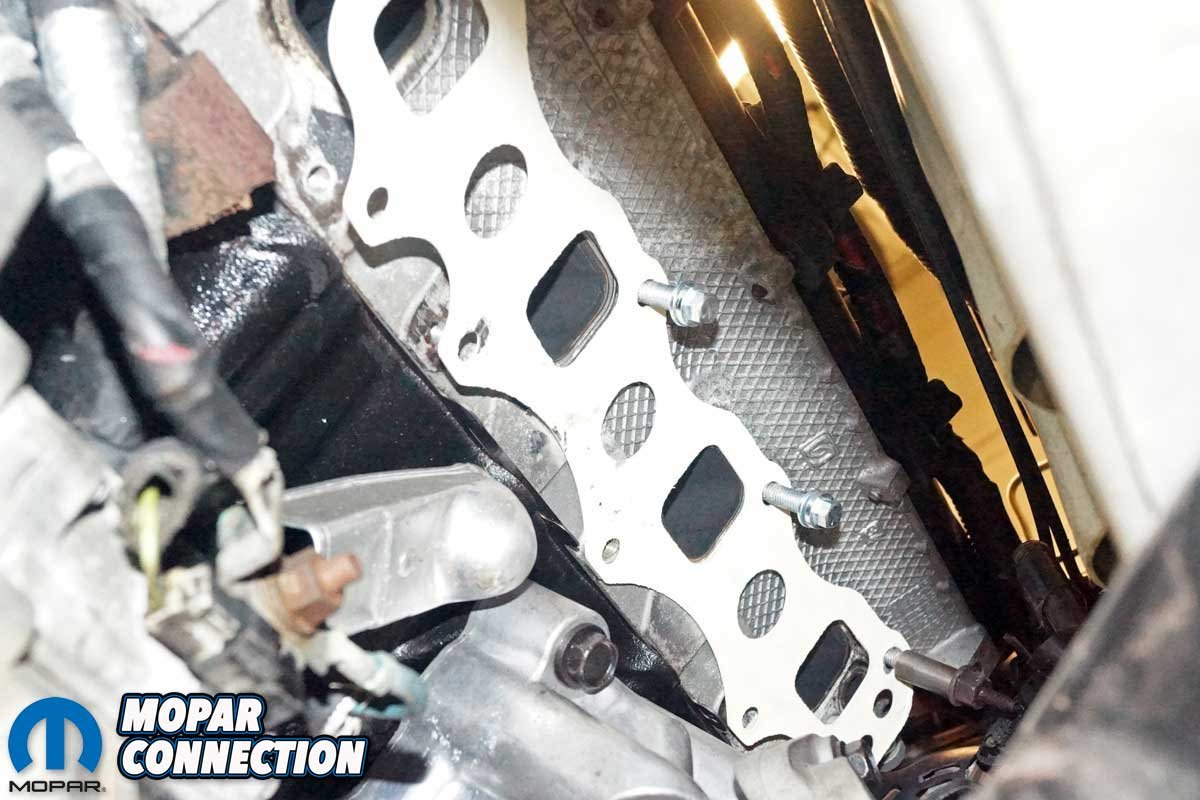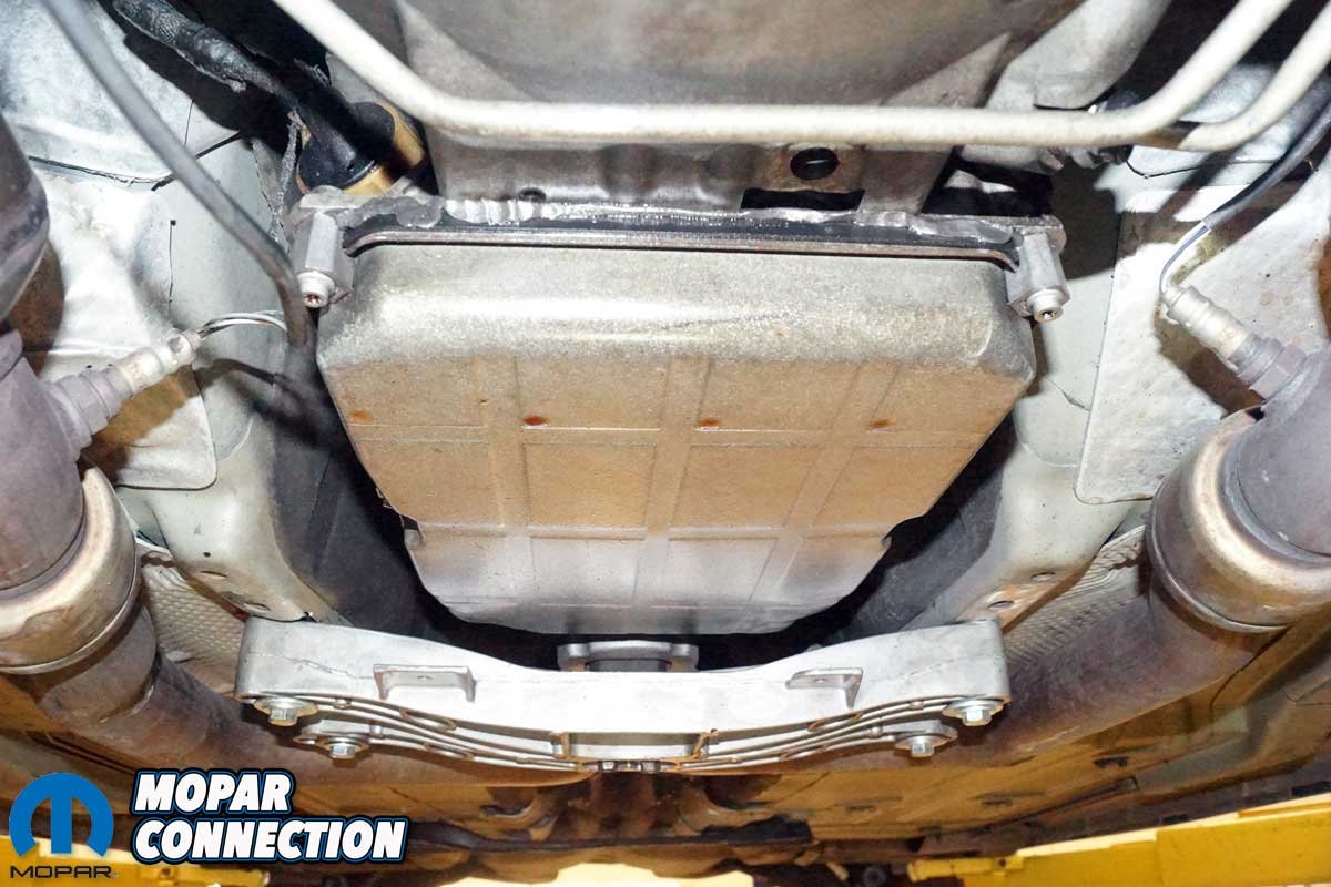 The removal of the factory exhaust manifolds began with the disconnecting of the negative battery cable. Next, the Charger had to be raised off the floor at least 36 inches and supported on four jack stands. It would be even better if there were access to a vehicle hydraulic lift. The belly pan was removed from the chassis, with the vehicle securely supported.