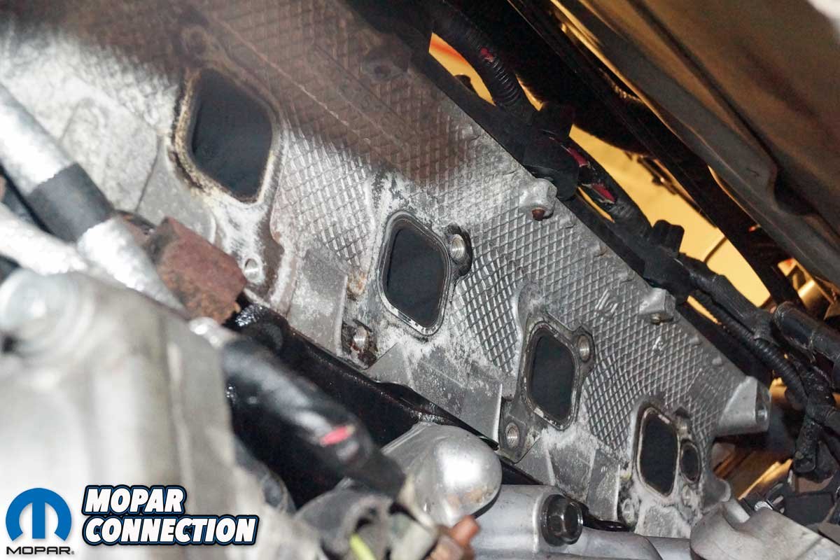 Above Left: After disconnecting the upstream O2 sensor, we struggled to remove the heat shield. The exhaust manifold removal required a combination of shallow- and deep-well sockets, swivels, extensions, and wrenches. Then, with a bit of cleanup of the head’s mounting surface, the header was prepared to be installed. Above Right: The passenger-side head required the same heat shield and manifold removal and cleaning touches to prepare for the header installation.