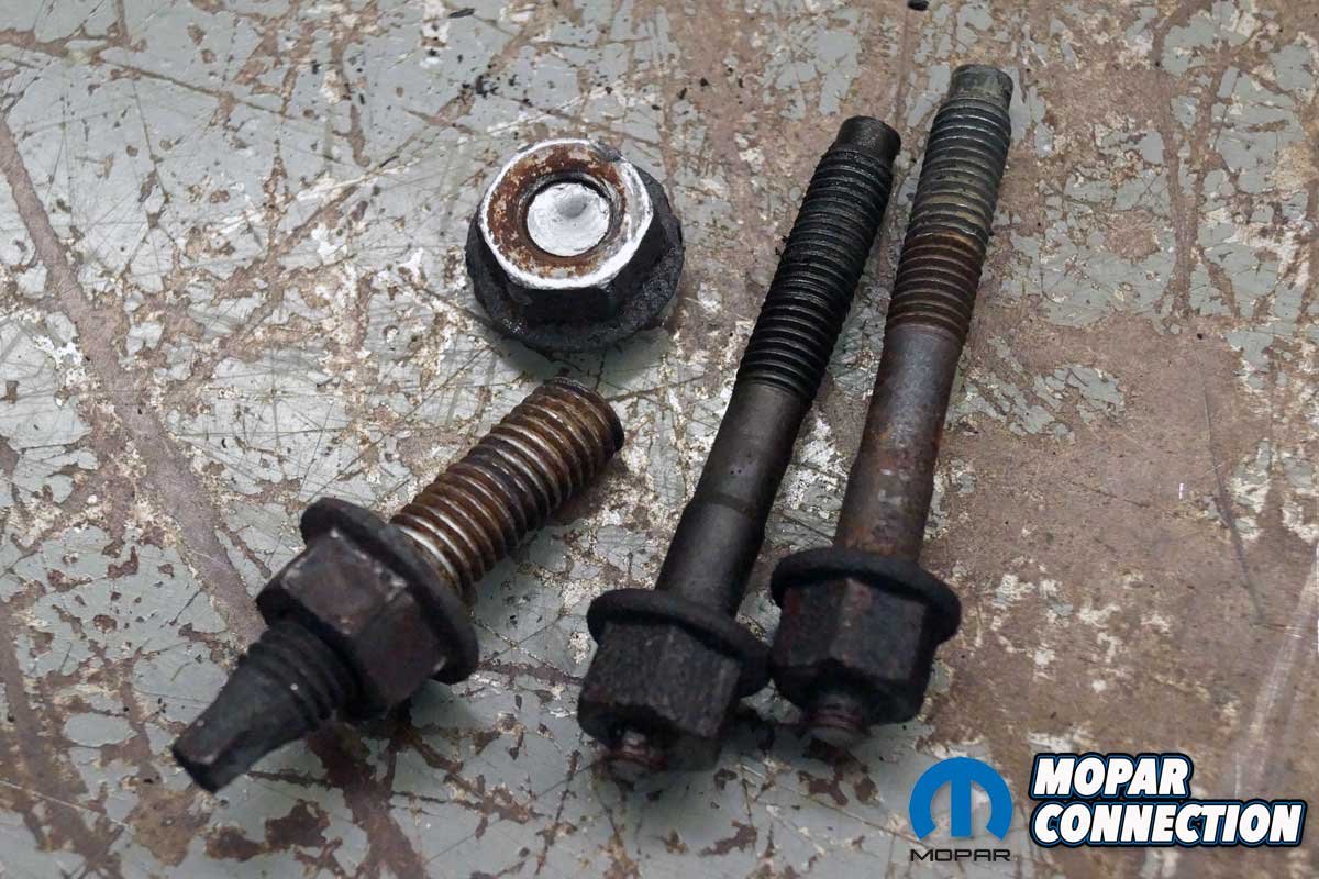 Above Left: Except for the converter pipes, all parts removed from the Charger were placed on a table. The dipstick and tube, one exhaust manifold bolt, and the O2 sensors would be reused. Above Right: An exhaust collector flange stud and two exhaust heat shield studs were broken during the disassembly of the exhaust. None of these fasteners were required for the assembly with the Hedman Hedders, but a new factory mounting kit was required when the factory parts were reinstalled.