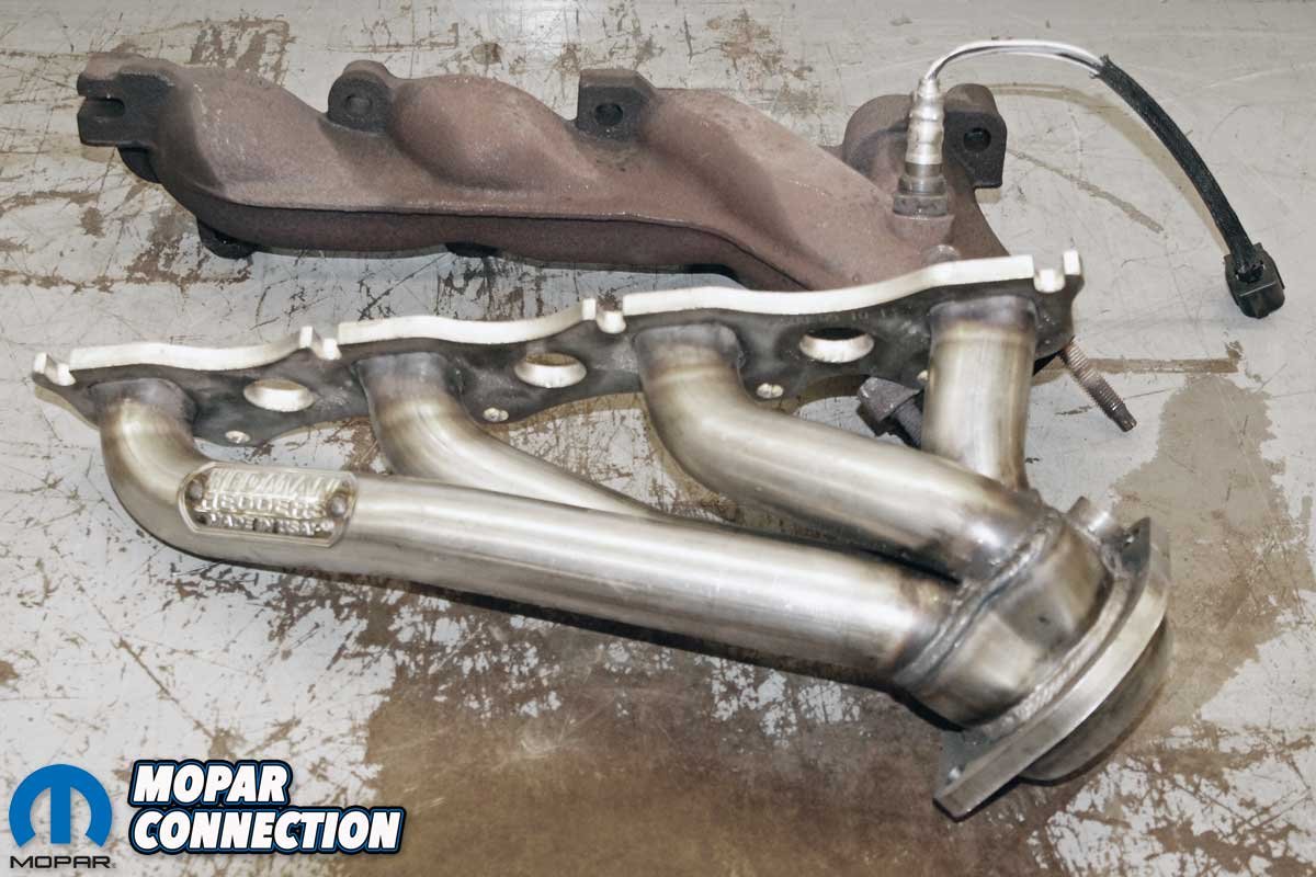 Above Left: The factory manifold was placed next to the shorty Hedman Hedder. Notice the header flange and the mounting bolt holes are cut out for ease of installation. Above Right: The upstream O2 sensors were removed from the factory exhaust manifolds and threaded into the header bungs. The driver-side O2 sensor had to be removed during installation to gain clearance for tightening the header bolts. The sensor was reinstalled after the header installation.