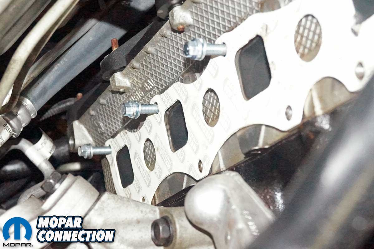 We installed the remainder of the supplied fasteners and torqued each to 16 ft-lbs, following the torque sequence found in the service manual. Except for the dipstick tube installation, the driver-side header followed the same removal and installation process.