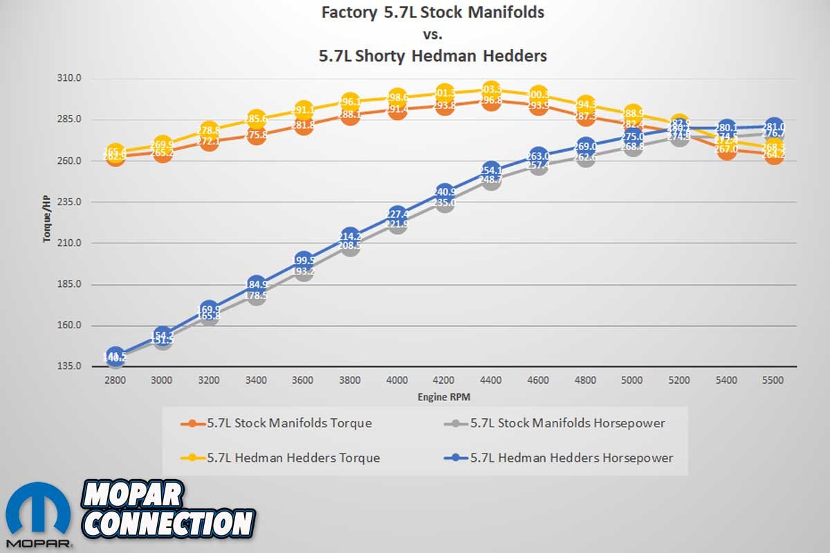 The 5.7L Hemi did not sound any louder with the Hedman headers, but there was a sharper exhaust note with a raspy metallic resonance. The Charger was put through the paces again for three more runs, and the headers provided a mild increase, raising the peak torque to 303.3 lb-ft at 4400 rpm, a rise of 6.5 lb-ft of torque over the baseline. Likewise, the horsepower increased to 286.1 hp at 5500 rpm, up 4.4 hp over the baseline.