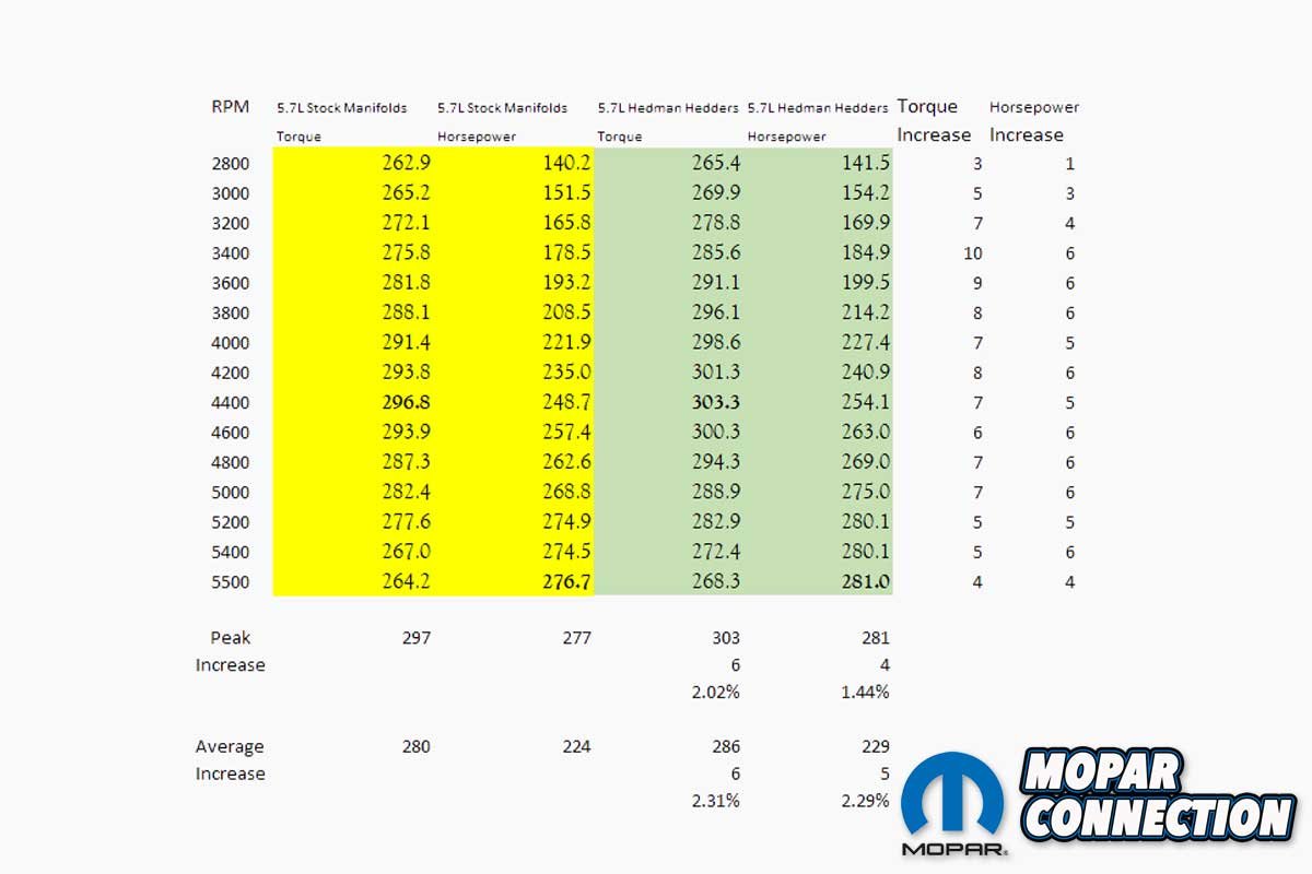 Above: The chart and graph display the performance increase of the headers. The installation of the Hedman Hedders increased the peak torque by 6.5 lb-ft and the peak horsepower by 4.4 hp. At low rpm, the headers provided a double-digit torque improvement.