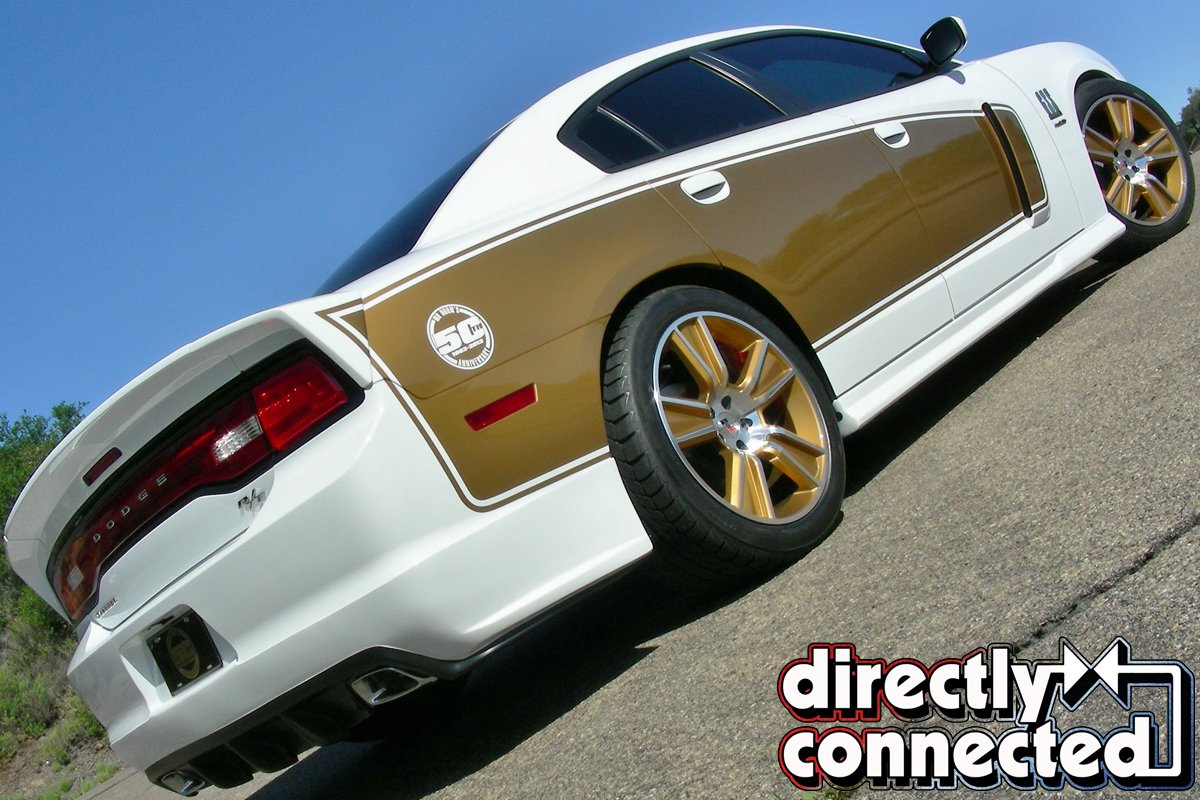 Above left: Contrasting 50th Anniversary GSS graphics amplify the classic body lines on the new Charger. Even the door scoops are reminiscent of those on the 1970 Charger. Unlike the production version, all of the graphics were custom painted on this Charger, making it a truly unique Mr. Norm’s 50th Anniversary GSS. Above right: 50th Anniversary GSS Charger looks long, low and sleek from any angle.