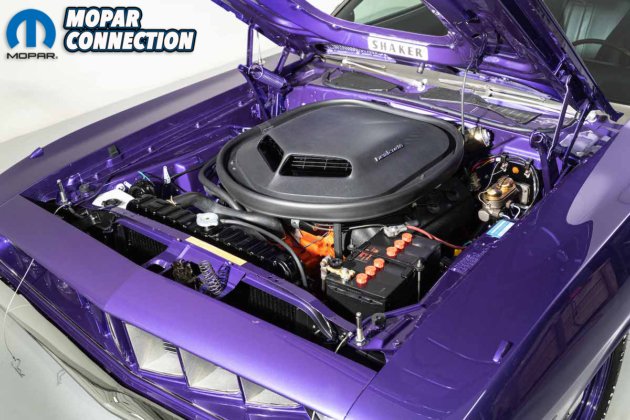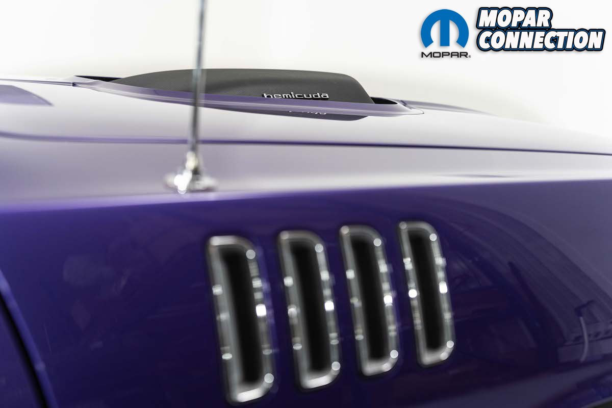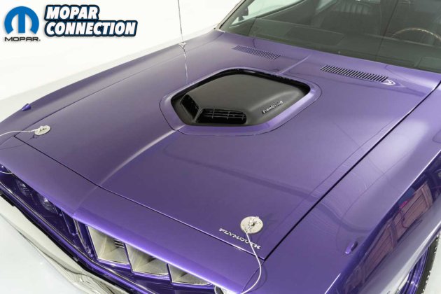 The Shaker hood scoop was an available option with the other engines offered in ’71 so it in and of itself is not an indicator of what’s under the hood. Only the smallish “hemi cuda” on both sides of the scoop reveal the power that’s available.