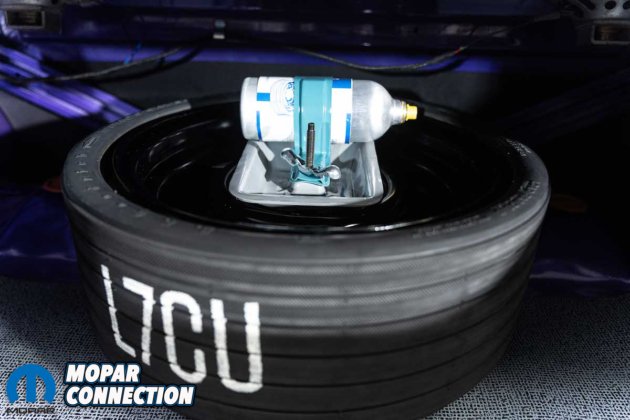 Above: The restored trunk includes the bumper jack, inflatable spare tire and the instruction sticker under the trunk lid. Check out the compressed air bottle mounted on top of the spare.