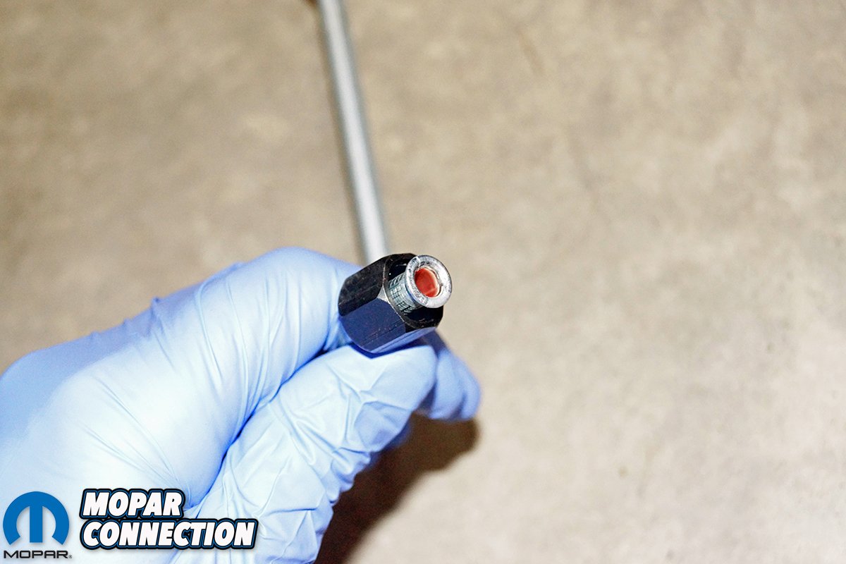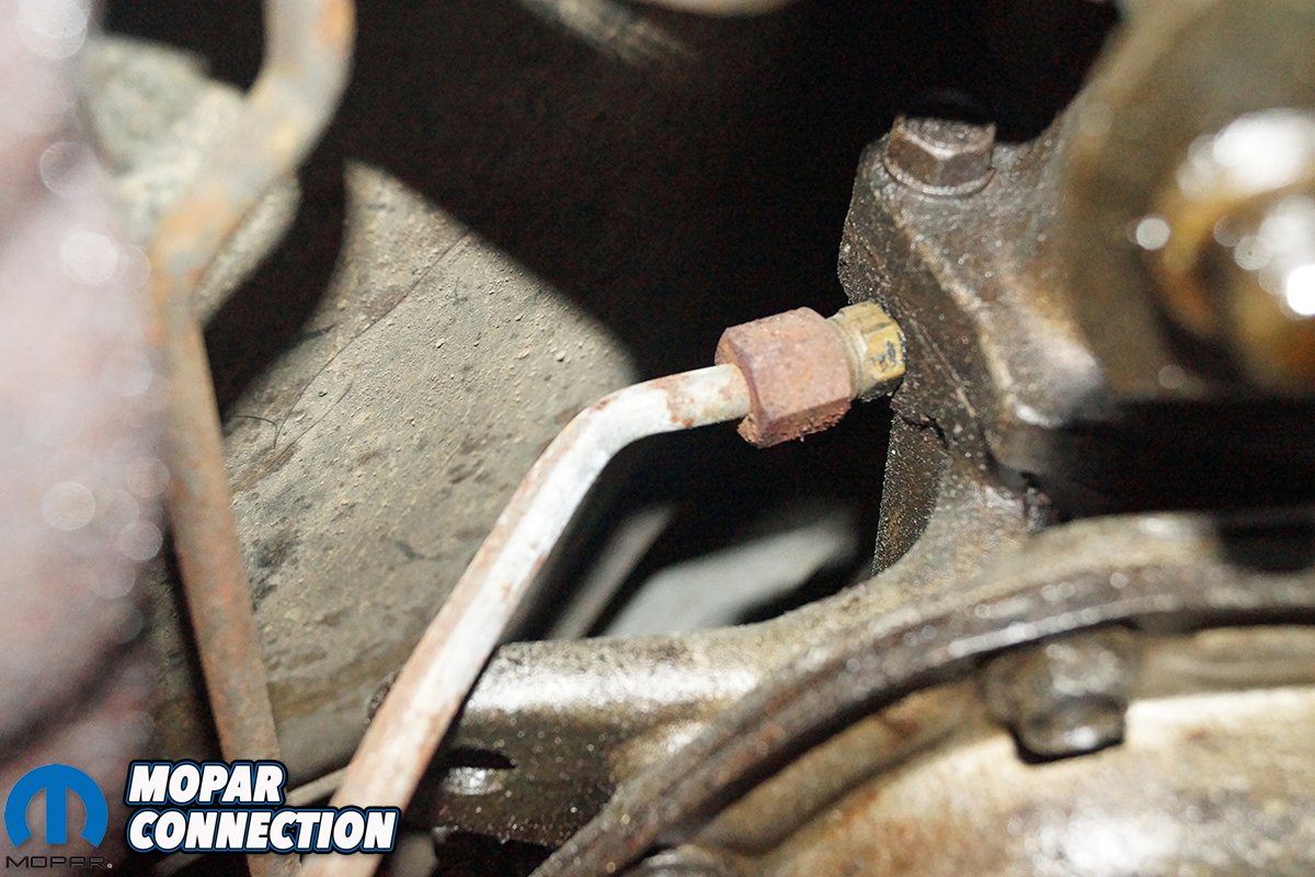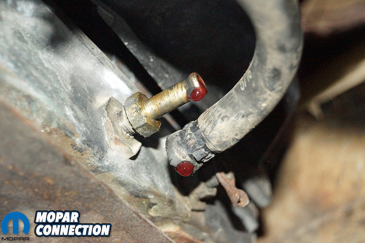 With the parts on hand, we started the mending of the Torqueflite by replacing the cooler lines. The rubber lines at the cooler were removed, and a small amount of transmission fluid leaked from each line as well as the cooler. We were taken aback to find barbed fittings in place of the factory 1/8-inch male NPT x 5/16-inch (-05 AN) flare (SAE) brass adapters.
