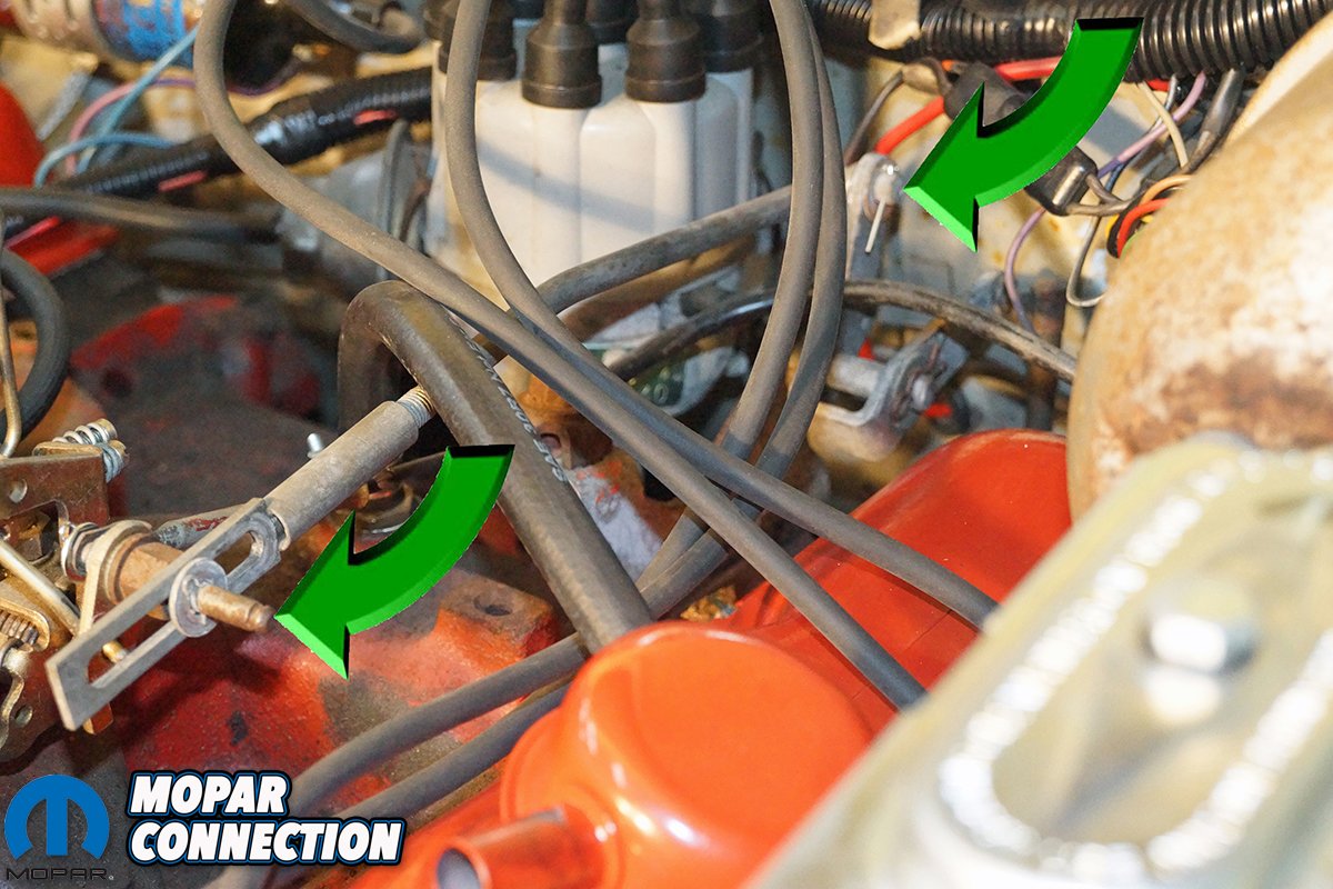 Top Left: The kickdown linkage was allowed to move to any position it desired because the kickdown spring was not installed. The green arrows show where the spring should have been installed with one end at the carburetor lever pin and the other at the kickdown bellcrank. Top Right: A Year One reproduction throttle kickdown spring (part no. BF340) fit our Dart’s Torqueflite kickdown linkage. The spring was a dark red color with a black stripe and mounted from the carb to the kickdown bellcrank. For the return spring, we found a reproduction for a 1971 340 engine (part no. TR29) that would work with our 2bbl carburetor. The spring came in a violet color. Bottom Left: To adjust the kickdown linkage, we installed the throttle return spring and the kickdown spring. We adjusted the carburetor choke to the off (open) position, so the throttle stop would be set to hot idle and not be resting on the fast-idle cam. Bottom Right: To adjust the linkage, we pushed the transmission kickdown lever (green arrow) to the full stop (toward the front of the Dart) and tied it into place with safety wire. The kickdown lever must be at the full stop. If it is not, the misadjusted kickdown linkage can lead to shifting problems or worse a damaged transmission.