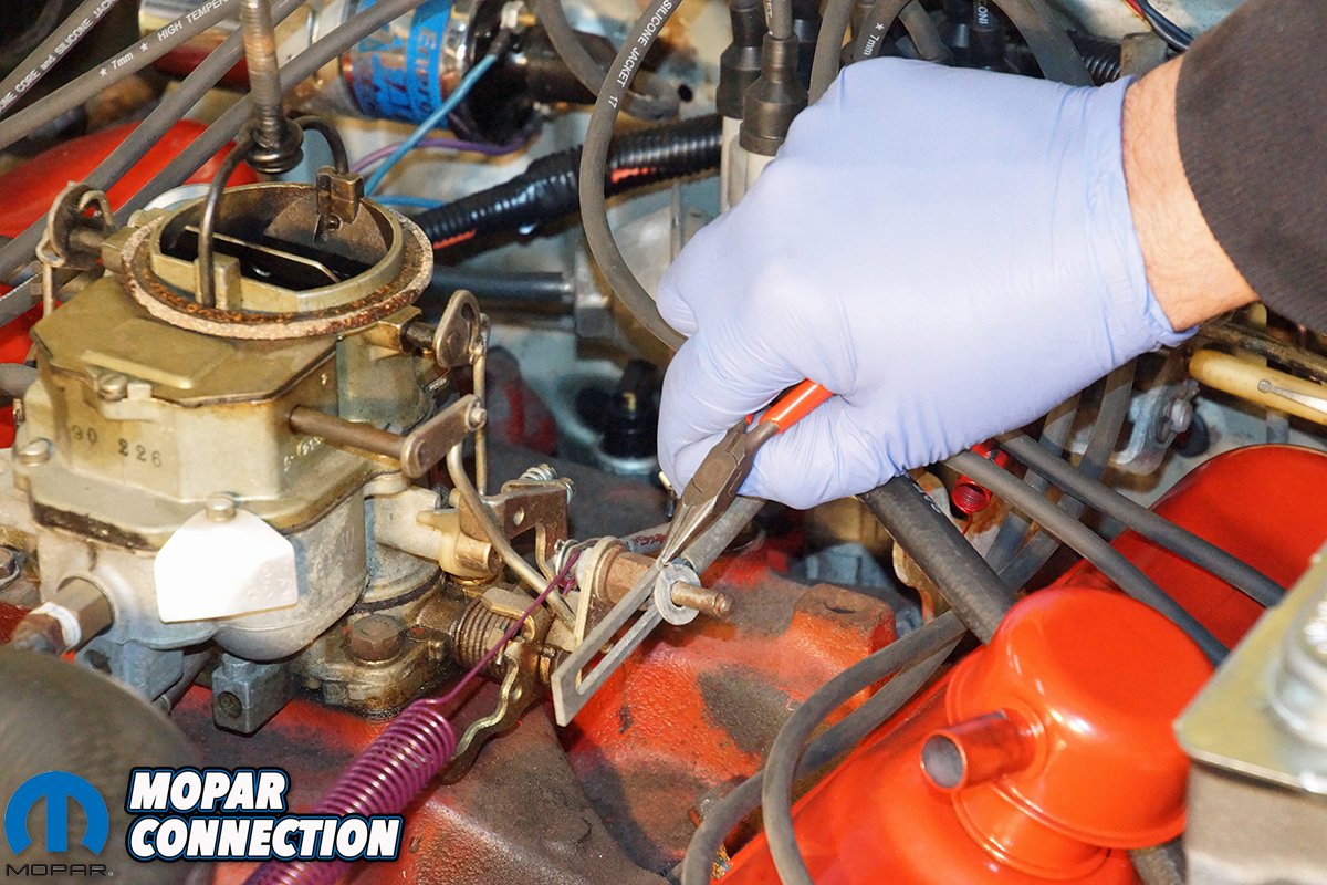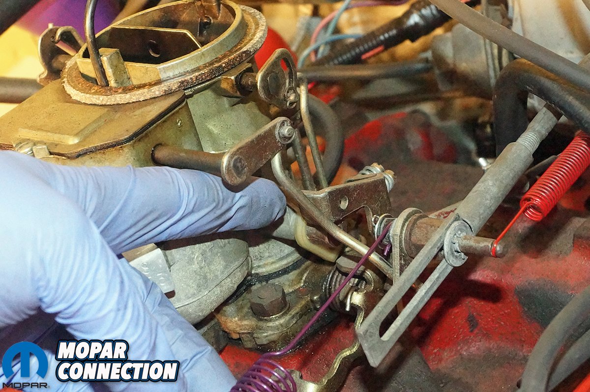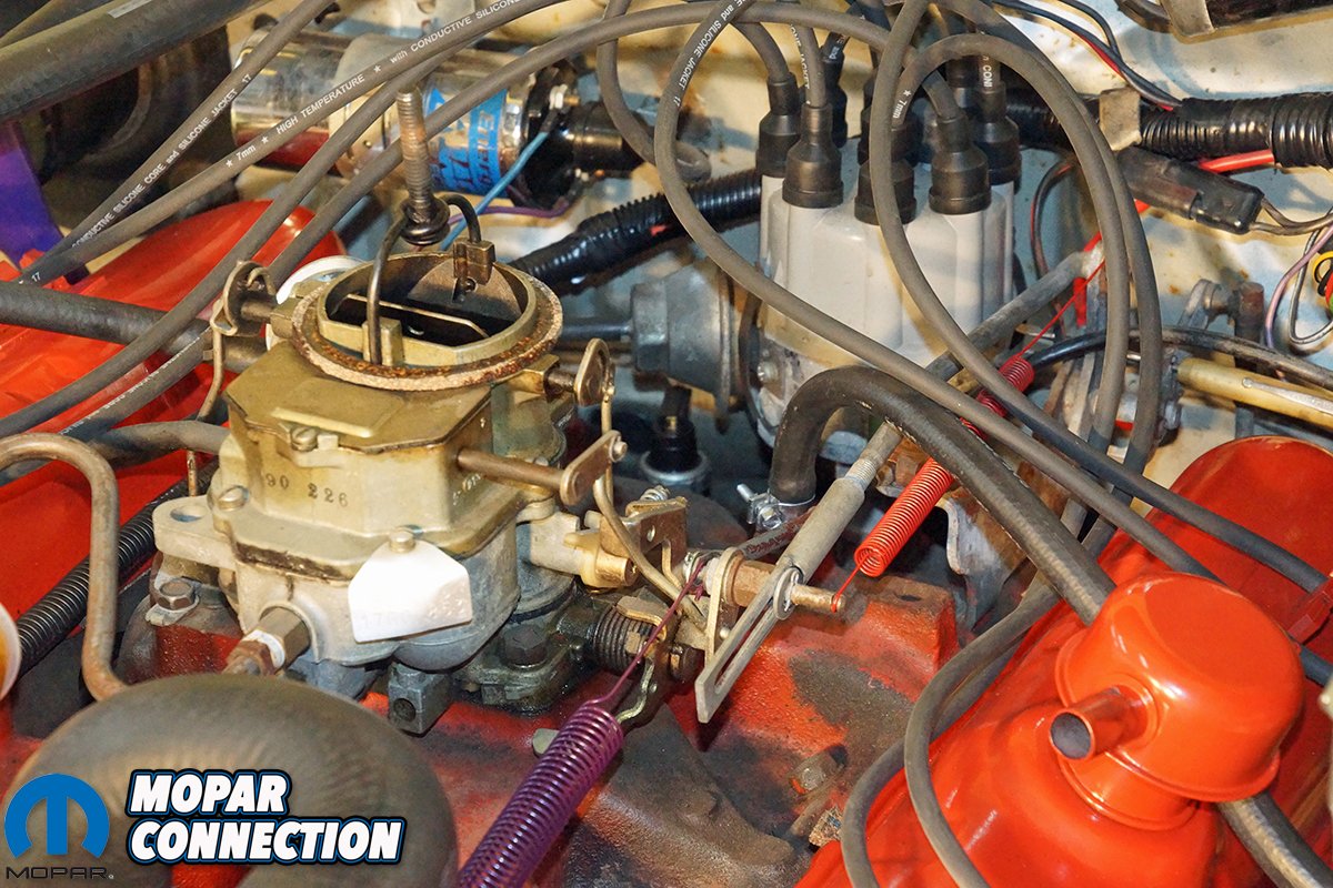 We selected a reproduction throttle kickdown spring (part no. BF340) that fit all 1966-1971 automatic transmission models except the Hemi. The spring had the correct dark red color with a black stripe, measured 7 ½-inches in length, and mounted from the carb to the kickdown bellcrank. While a throttle return spring for our 2bbl carburetor was not offered, we found a reproduction throttle return spring for a 1971 340 engine (part no. TRS9) that would work for our Dart.