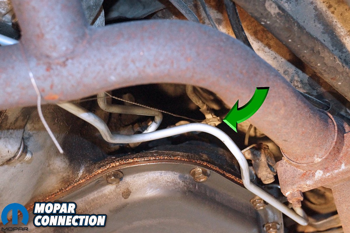 Luckily for us, a pair of these brass adapters had been removed from the radiator of our 1969 Dart in the summer of 1991 and stored in our tool box for the last twenty-eight years. A 5/8-inch wrench loosened the cooler lines from the transmission, and before the lines could be removed, they had to be separated from each other by removing a clip holding the two lines together. This clip was found about midway between the radiator cooler and the transmission inlet and outlet adapters.