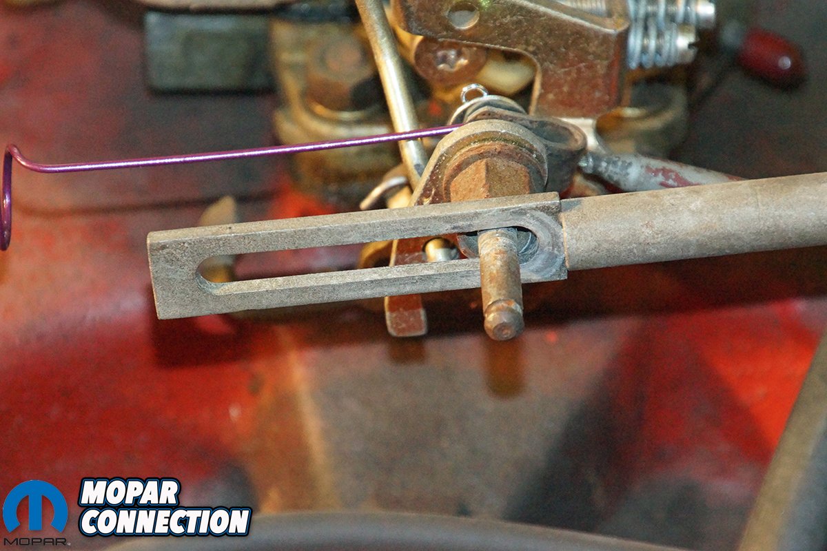 In the engine bay, we removed the non-stock throttle return spring and installed the new Year One violet colored spring. It fit perfectly, and required much less foot pressure on the throttle pedal to open the carburetor butterflies. The red kickdown spring was positioned on the carburetor lever pin, which was attached to the carburetor linkage and the upper bellcrank on the kickdown linkage. To adjust the linkage, we slipped under the Dart and pushed the transmission kickdown lever to the full stop (toward the front of the Dart) and tied it into place with safety wire.