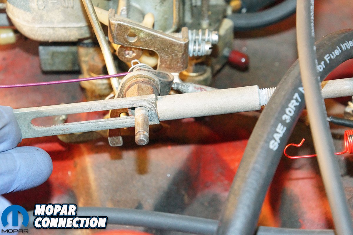 Back in the engine bay, the choke was placed in the off position, and the intermediate transmission rod was removed from the bellcrank by popping the ball socket loose on the upper end of the rod. A small 3/16-inch screwdriver was slipped between the bellcrank and lever to secure the linkage from moving, and the intermediate transmission rod’s length was adjusted to line up the ball socket with the ball on the lever. The new kickdown spring was removed, and the carburetor rod was pushed rearward to take up the slack.