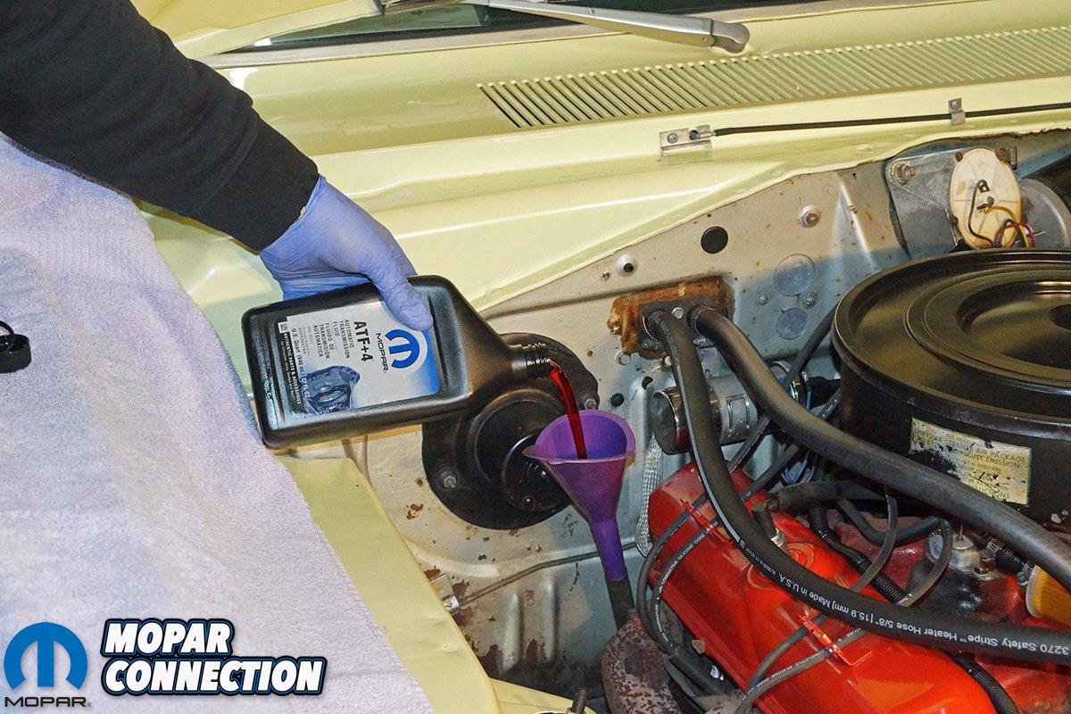 Above Left: With the new throttle spring in place and the kickdown linkage adjusted with the new kickdown spring, we pulled the screw driver from the bellcrank and lever. Above Right: We added five quarts of AFT+4 transmission fluid to the Torqueflite. We took it out for a test drive and rechecked the fluid while in neutral to verify correct amount was added.