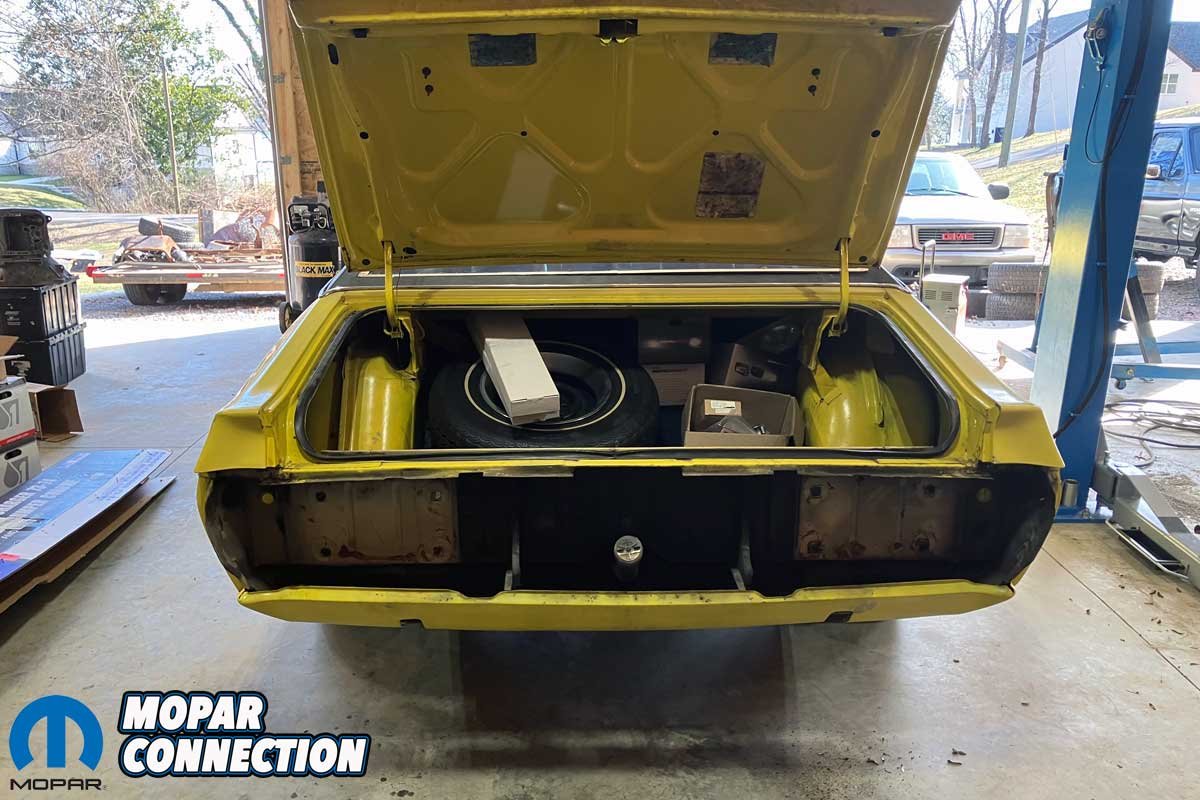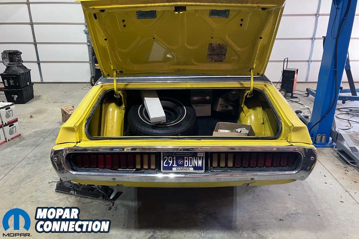 In addition, we sourced a ’71 Super Bee bumper assembly to scavenge shorter brackets, allowing for a clean bumper tuck. We started by disconnecting the rear lighting harness from the trunk. After pushing the rubber plugs and wires back inside, we unthreaded six bolts and two studs, allowing the bumper assembly to slide off.