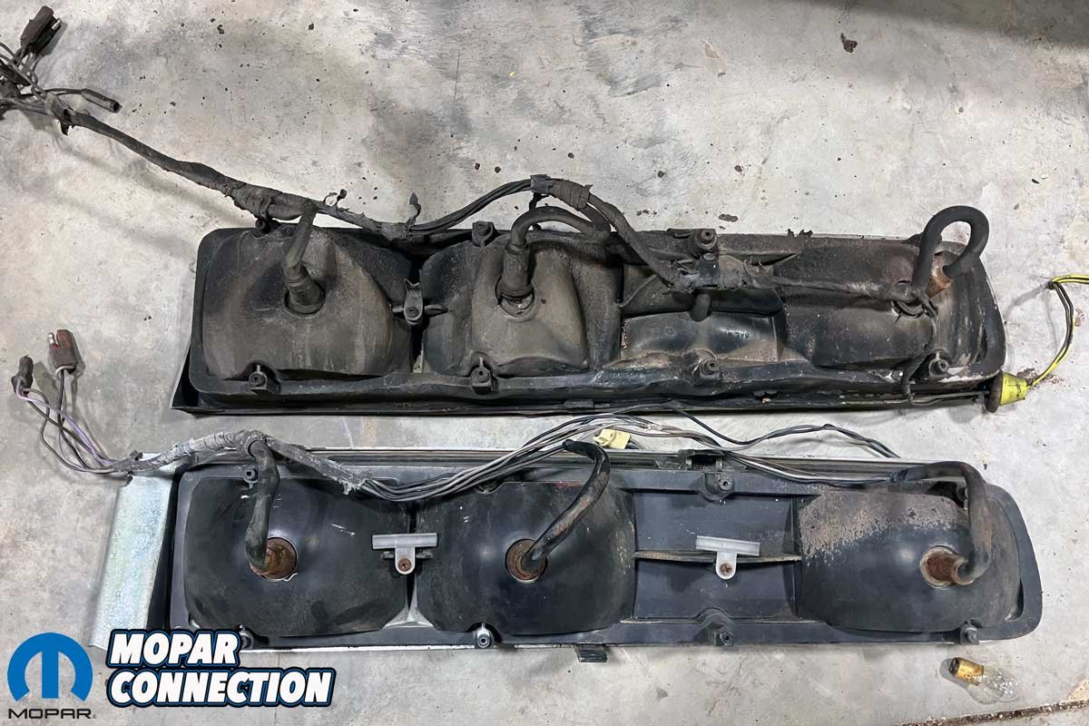 Above Left: The original rear bumper had rust problems, and the rubber trim around the bumper was damaged. Additionally, the taillight lenses were dull. Above Right: After disconnecting the wire connectors and tucking the wires out of the way in the trunk, we removed several bolts and two fasteners from studs and pulled the bumper off the Charger.