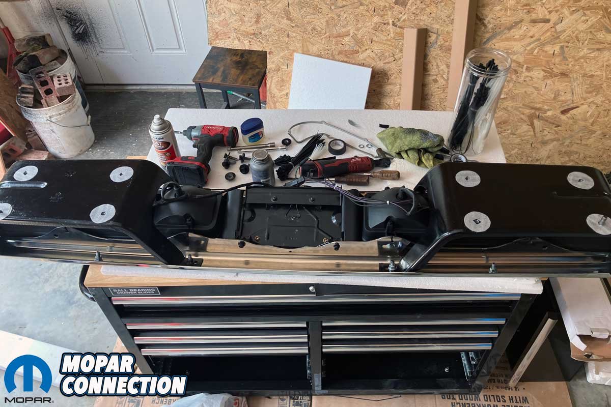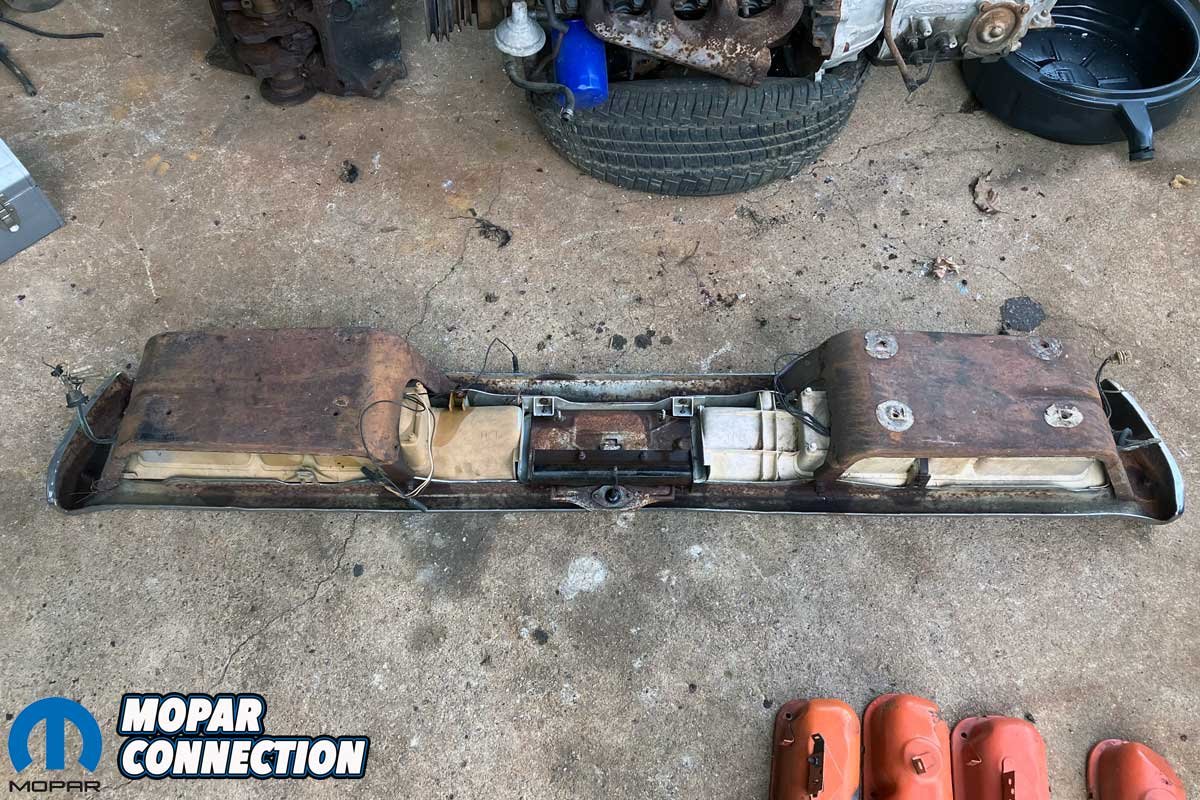 Once removed, the bumper was placed on two sawhorses. A torch and PB Blaster helped us break down the undercoating and loosen stuck hardware. After removing the brackets and crash bar, we turned to the taillight buckets, only to have them disintegrate during the removal process. Replacement was the only option.