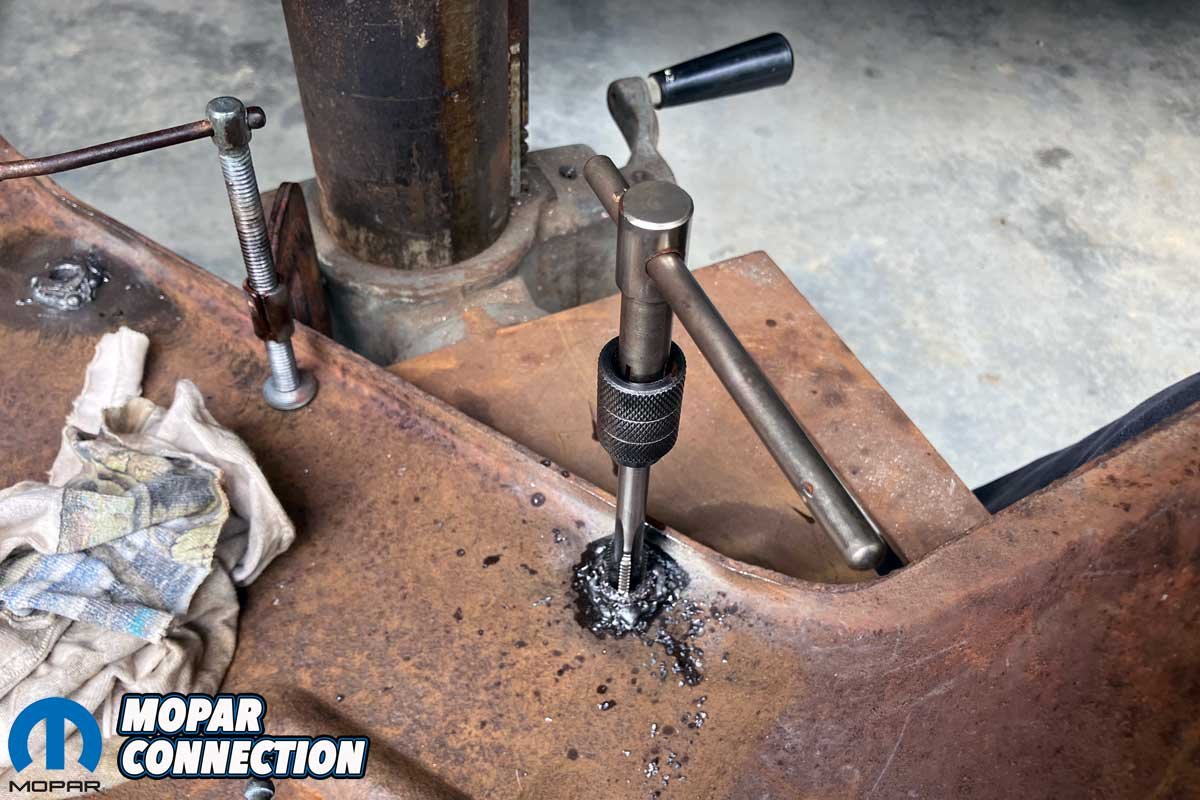 Above Left: We drilled the bumper bracket mounting holes to 1/2-inch oversize. Each hole was tapped in preparation for inserts. Above Center: We installed Time-Sert inserts into each tapped hole with the application tool. Above Right: The Time-Sert inserts ensured a quality repair that was comparable in strength to the original mounting point.