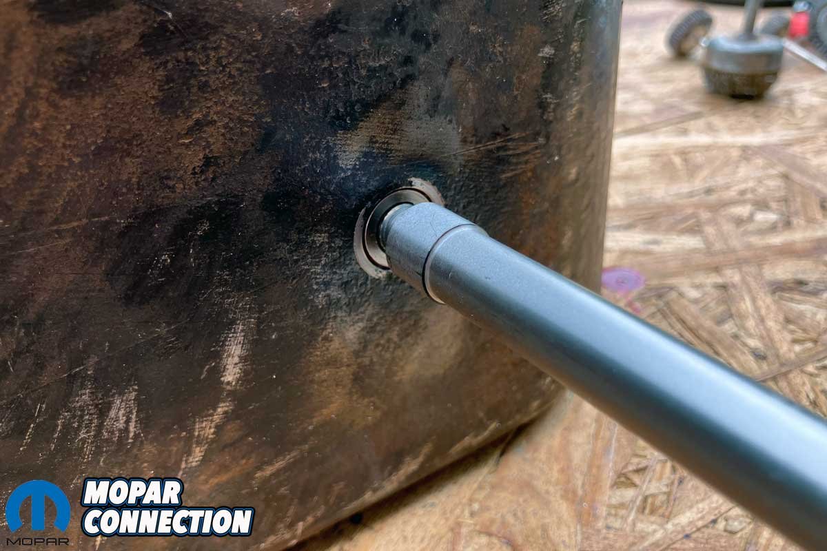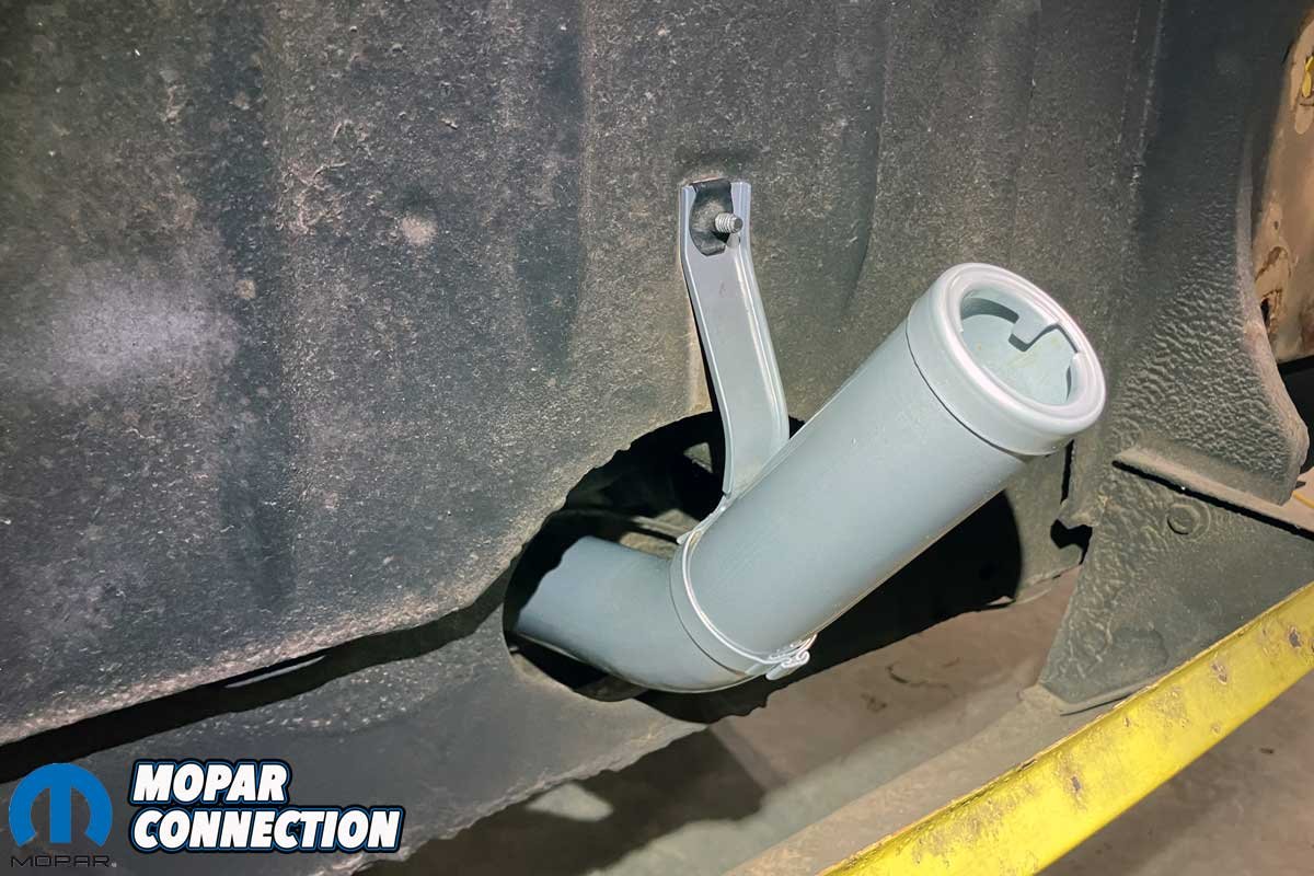 The bumper tuck required a shorter filler neck due to the reduced bumper offset. The solution was to install a ’71 neck in place of the longer ’73 version. We removed the filler tube bracket, greased the replacement neck, and slid it into the tank using the same mounting bolt. We had recently replaced the grommet, so we reused it.