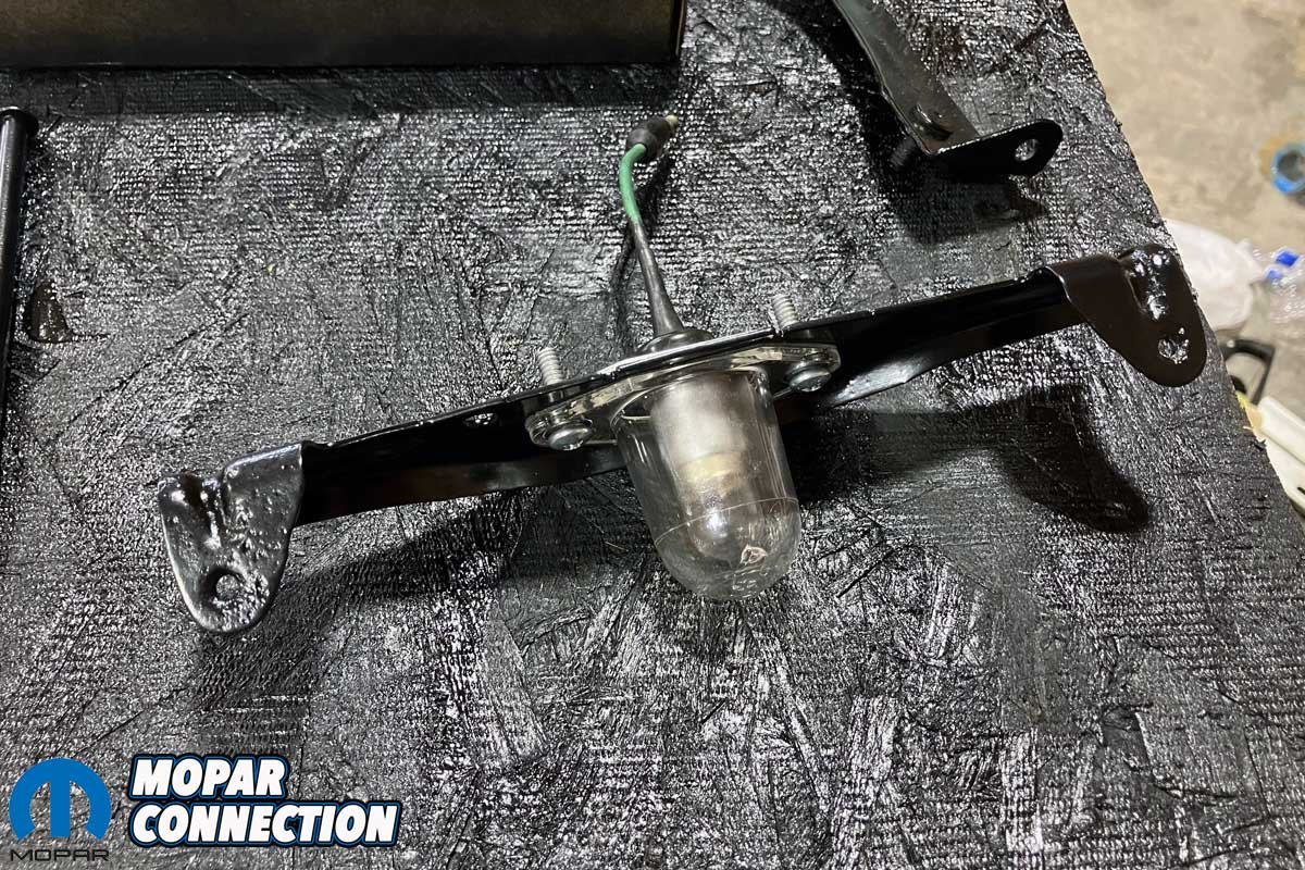 With the metalwork complete, we cleaned and painted the brackets, tag lamp bracket, and small hardware. We then fitted a new Sylvania bulb in the tag light housing and installed a lens from Classic Industries.