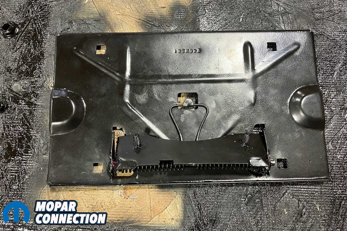 Above Left: We installed the license plate hinge and license plate light brackets to the bumper. Above Center: The license plate flap was installed on the AMD bumper assembly. We reused the factory fasteners after cleaning and painting them. Above Right: The center and one side of the bumper are assembled. Everything has been cleaned and painted to ensure a corrosion-free assembly.