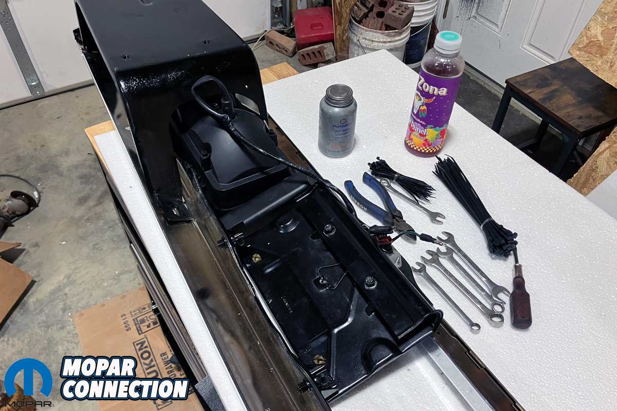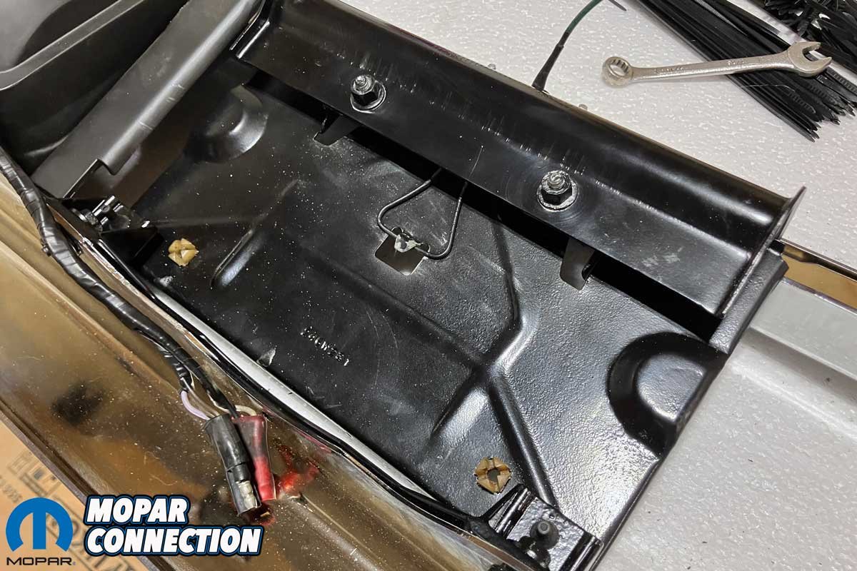 For the taillight buckets, ’73 Rallyes had a blackout finish, so we restored the factory blackout using flat black paint. We rewrapped the taillight harnesses and, due to a lack of reproduction clips (pins), secured the buckets with zip ties.