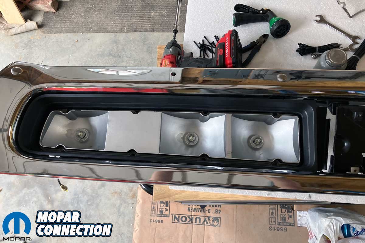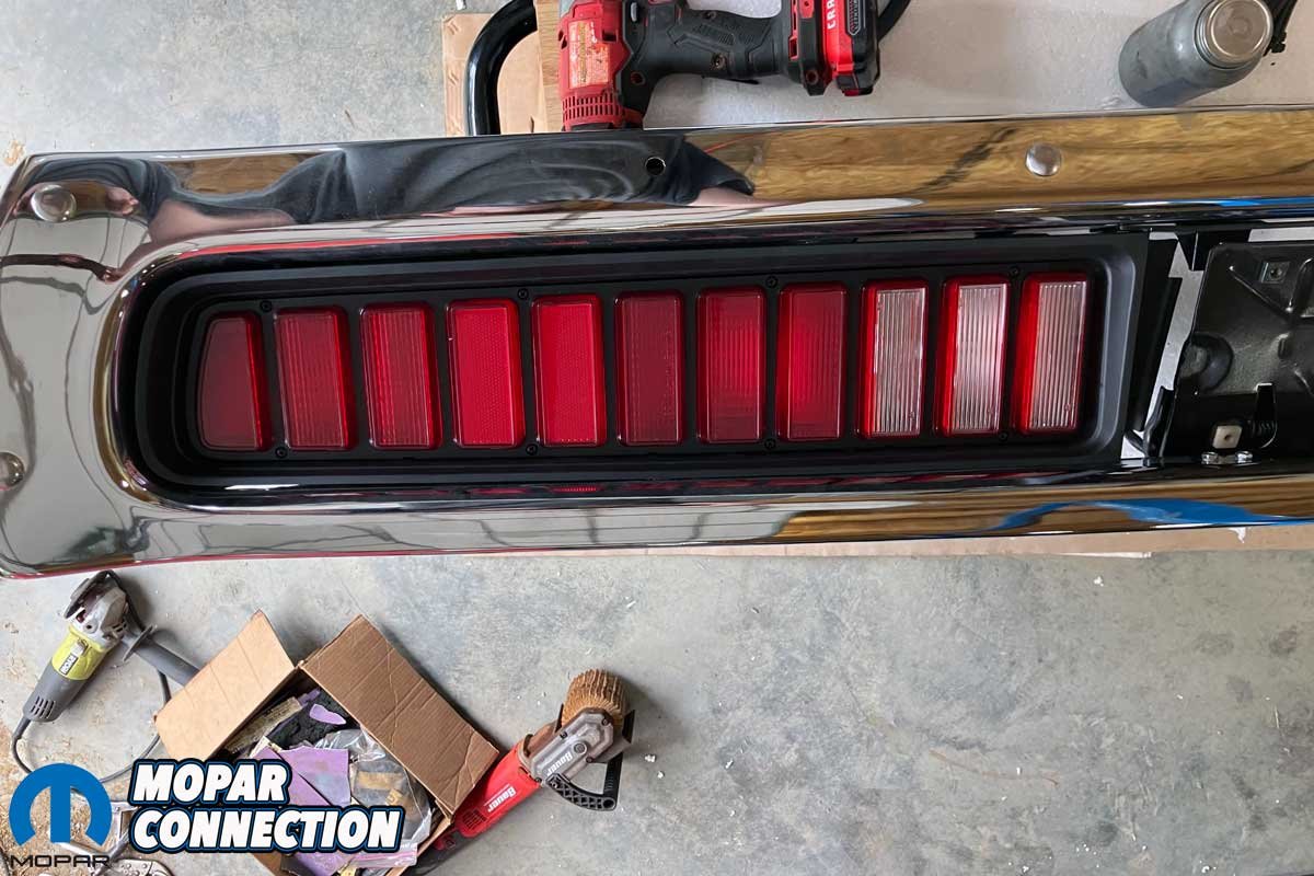 Laying the AMD bumper face down on the sawhorses, we began the reassembly process. We installed the lower license plate bracket, the plate bracket rubber bumpers, and the license plate flap. In each taillight bucket, we added Holley RetroBright 1157 and 1156 bulbs to their respective receptacles. Lastly, we mounted Classic Industries lenses using the original hardware.