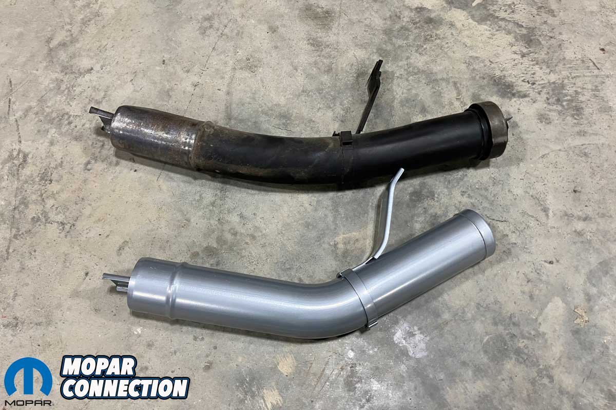 Above Left: It is obvious there is a difference in length and angle between the ’73 filler neck (top) and the ’71 filler neck (bottom). Above Right: Because we elected to use the ’71 bumper brackets, the bumper was drawn closer to the body. We correspondingly had to use the shorter and more angle ’71 filler neck for our application.