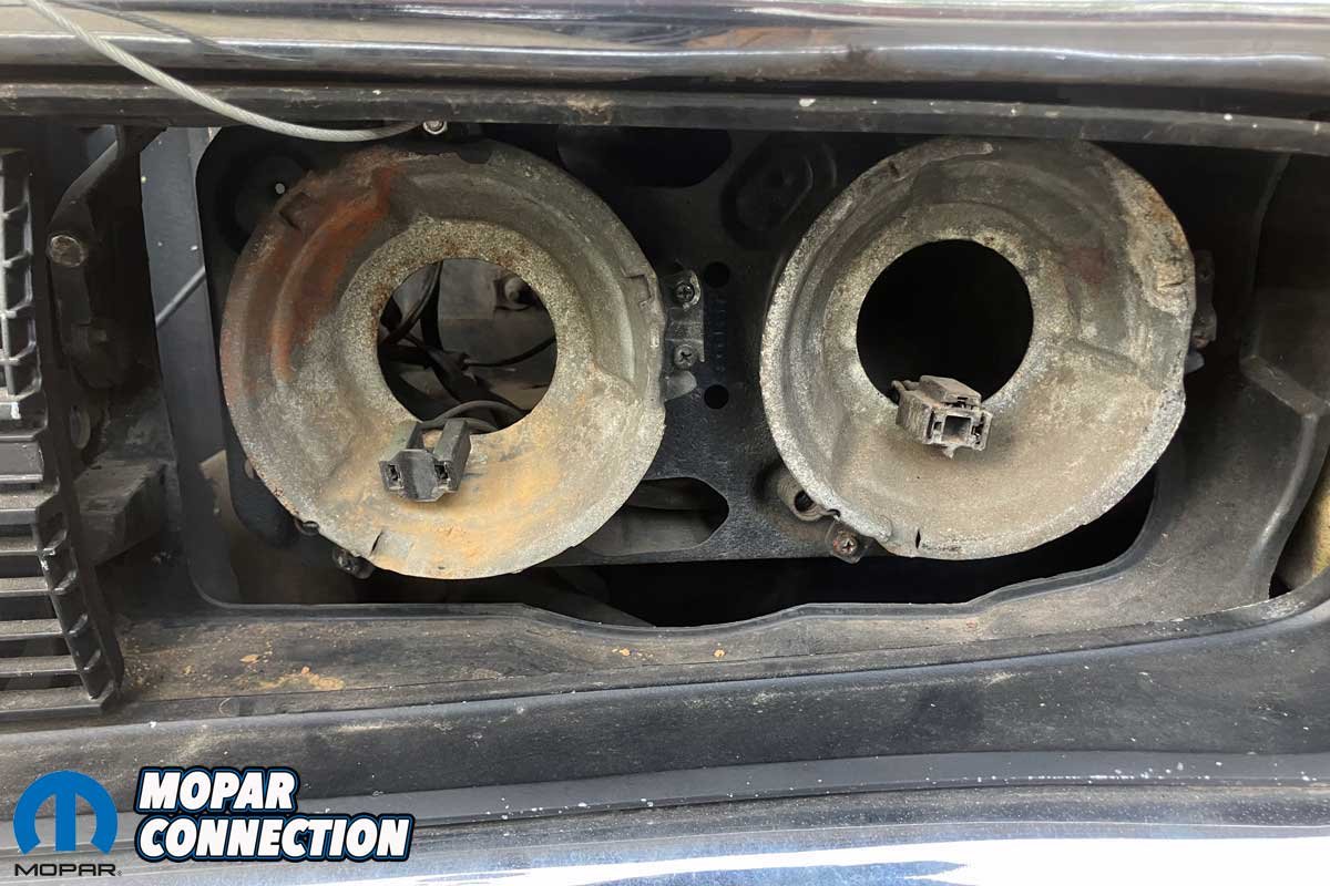 The Charger’s rear end had endured the most significant damage. The rubber strips around the bumper had dried out and cracked, while the steel bumper had rusted through in places. The taillight buckets had melted, the side marker lenses were badly hazed, and the headlights barely illuminated the road, making night driving a risky endeavor.