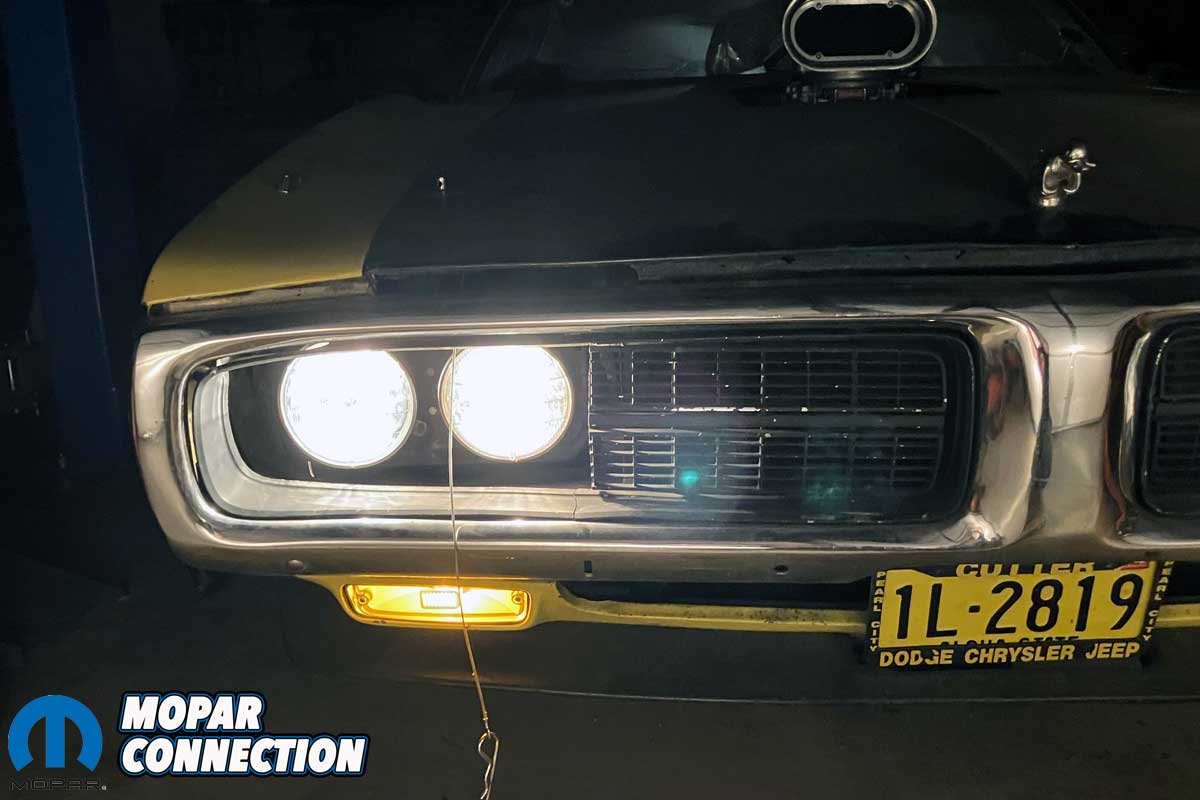 Above Left: The incandescent headlights, while in the high-beam selection, were less than adequate. Above Right: After installing the RetroBright headlights, we noticed a significant increase in illumination. For more in-depth information about the Holley RetroBright headlights, check out Mopar Connection Magazine’s “Holley’s RetroBright LED Headlamps Provide Superior Lighting” article from 2022.