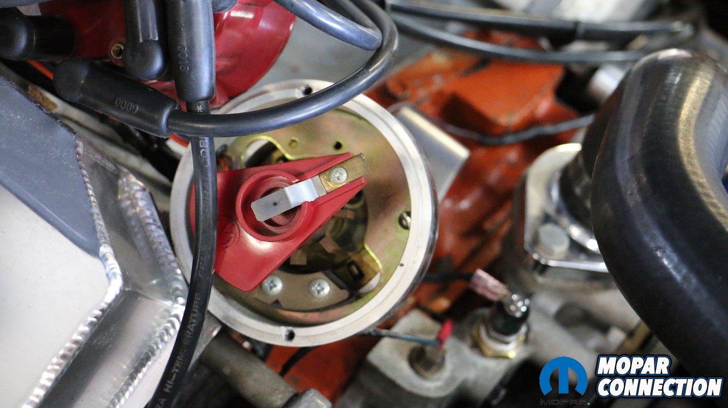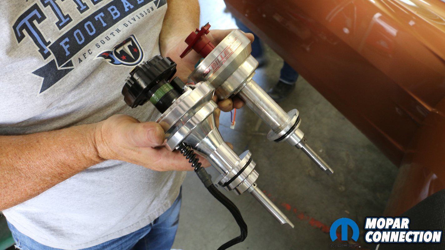 Above left: Mopar Connection Tech Editor Mike Wilkins begins the removal of the previous ignition system. Above center and right: Wilkins noted where exactly the rotator was aligned prior to removing it.