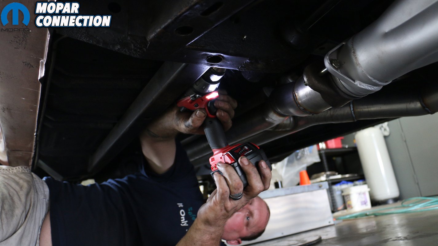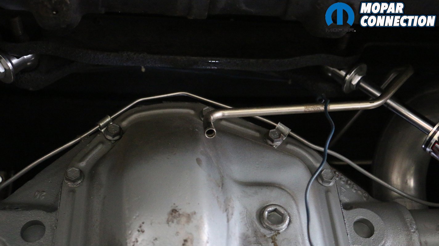 Above: In routing our positive fuel line, we ran the high-pressure rubber fuel hose provided by FAST from our factory Chrysler in-tank pickup up and over the differential and down the subframes, running on the inside of our subframe connector until it reached the forward subframe. There the fuel lines ran up the firewall to the throttle body.