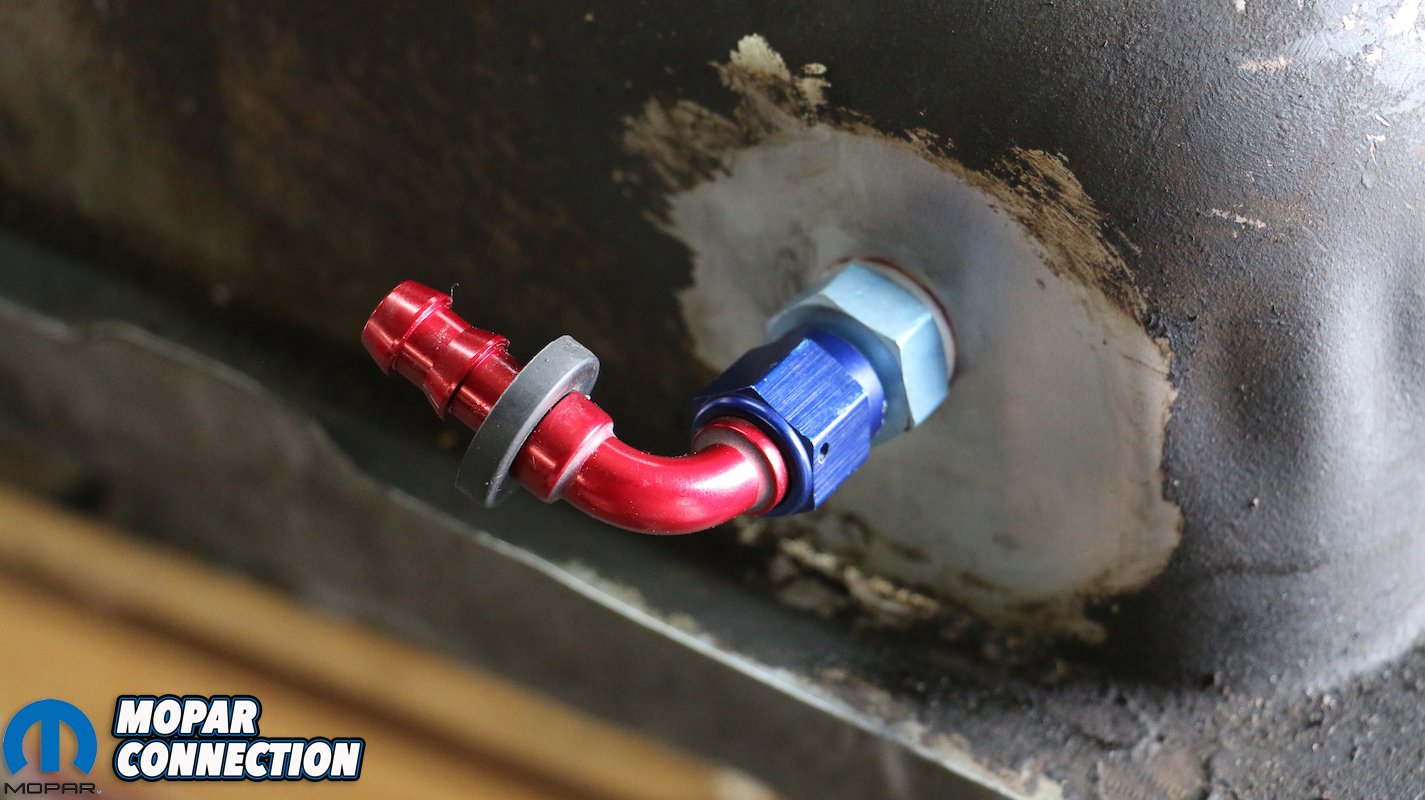 Above: The EZ-EFI 2.0 is capable of running either with a return fuel line or with a returnless setup. A returnless system requires that the fuel pump be mounted in the tank, while a return system allows for the pump and filter to be mounted externally. Either way, we were going to need to drop the tank so we could plumb in a return line. We cleaned the tank and installed a bulkhead fitting for the return line.