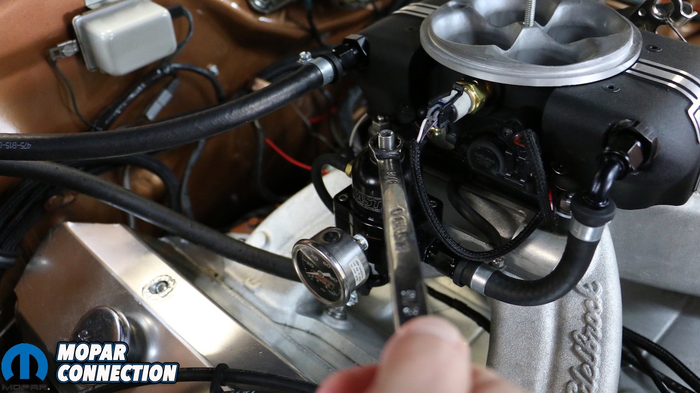 Above: One final step prior to firing up the engine is that the Startup Wizard will confirm the fuel pressure level (it’s supposed to be 43 lbs.). Ours read a little low, so we needed to adjust accordingly. A vacuum line also runs between the throttle body and the regulator.