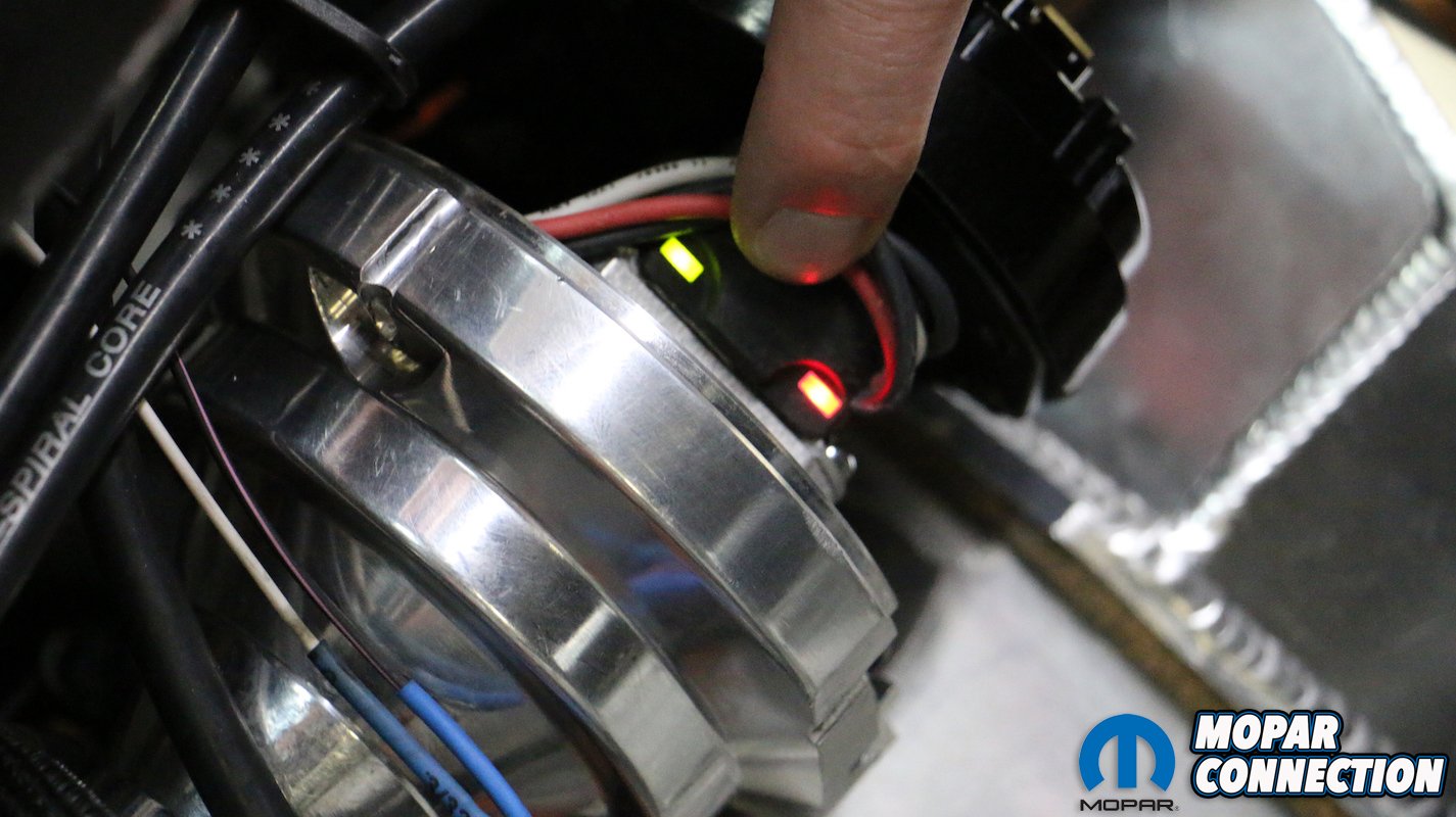 Above left: When the new rotor is properly aligned towards the number one cylinder, the distributor’s LED module will illuminate both a red and green light indicating the cam and crank signals, respectively. Above right: With both LEDs lit, we locked down the distributor and reinstalled the cap. The ECU will be able to advance or retard timing depending on load and the parameters programmed into the dash.