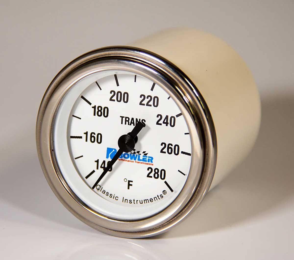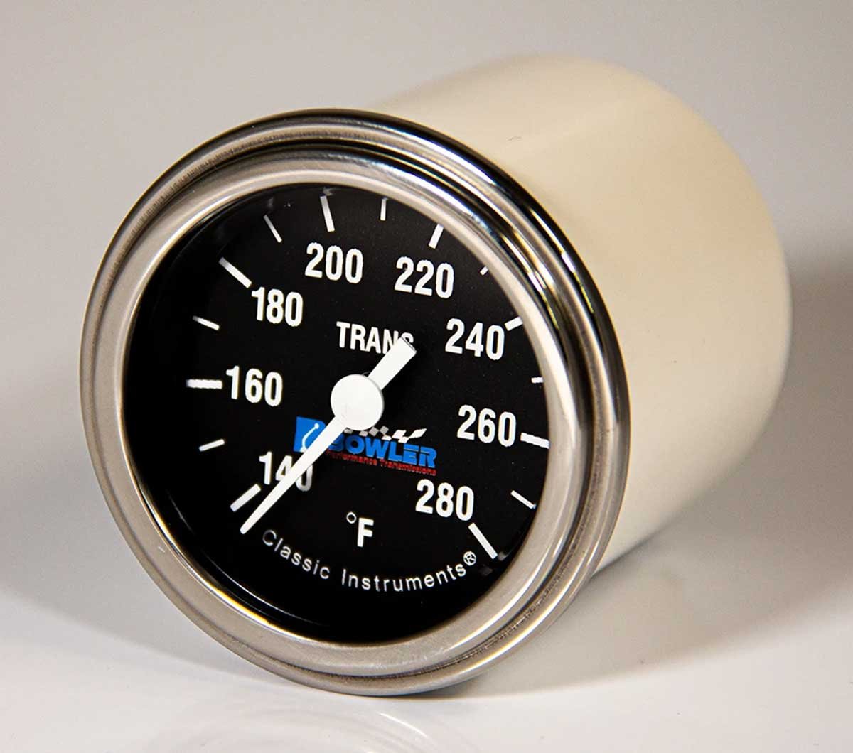 Above: Bowler Performance Transmissions teamed up with Classic Instruments to develop transmission temperature gauges with a black or white face. Each analog gauge has a 140-280°F range. The gauge will fit in a 2-inch opening.