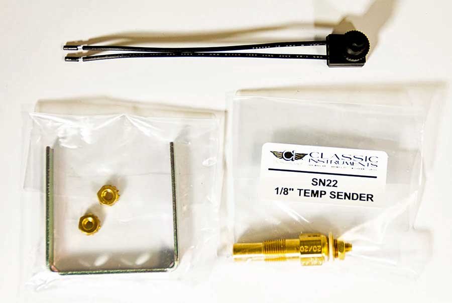 Above Left: The gauge comes with all the mounting hardware, the temperature probe, and the connector for the probe. Above Right: Also included with the gauge is a complete wiring harness.